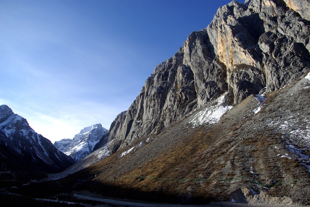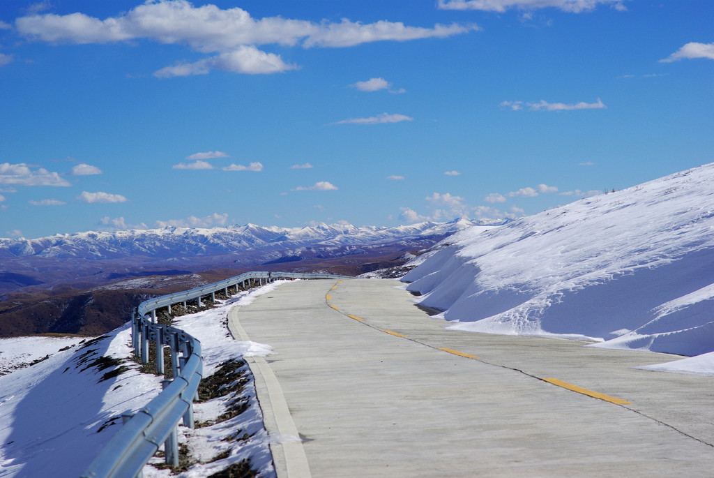 走这条上南路,先是沿着崎岖蜿蜒的山路一直向上,随着高度的不断提升近处的浅山都渐渐落于脚下,而远处的高山又呈现在视野之内,但之后它们也不再显眼,而更远处有连绵的雪山横亘于天际,壮丽无比。再抬头仰望前方,碧蓝天空之下云朵相伴左右,仿佛触手可及,这里海拔已经有四千多米。
