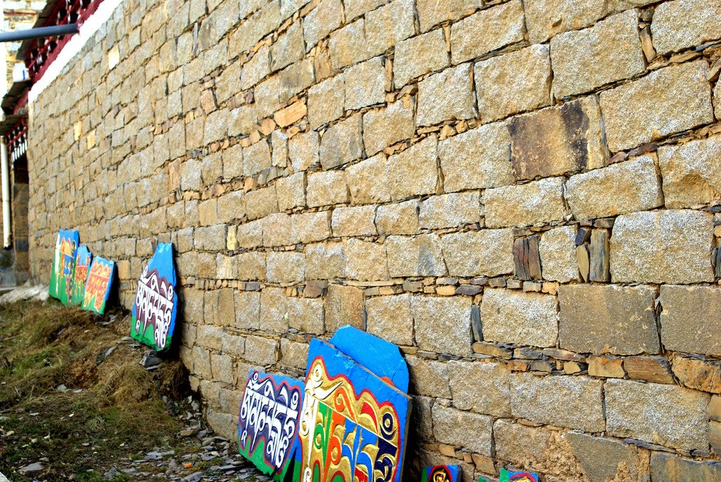 格日玛村的寺院有个高达十多米,全部是用一片片嘛呢石堆积而来的石墙,那个细密紧实的堆叠着实让人赞叹,也惊讶于雕刻这成千上万的石头是何等巨大的心血。嘛呢石,是刻有藏语经文或者六字真言的石头,常放在寺院,路边或山坡上。