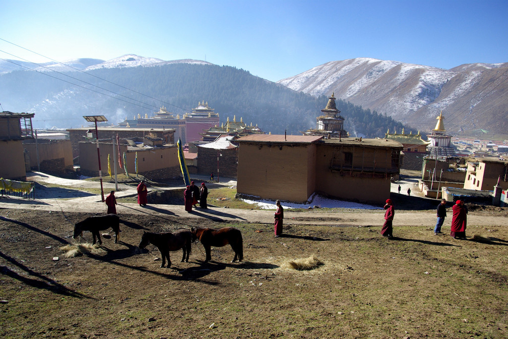 佛学院距离县城约20公里,路非常好很快就到了入口处。这是一个长长的爬坡路,两旁的山坡开始出现连片的房屋,在冬日的阳光下显得格外的醒目,不过这些并不是修行者们居住的而是当地的村民修建的房子。