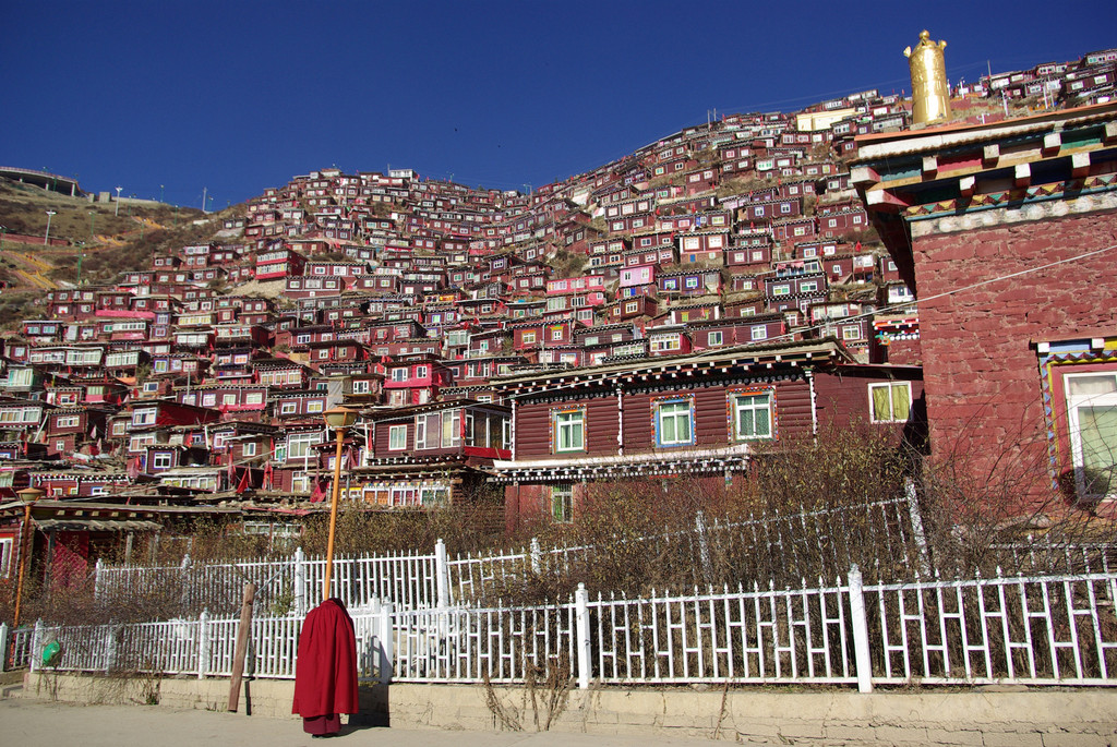 这条公交线路可以一直通到佛学院的最高处——坛城,道路蜿蜒曲折。您会途经佛学院大经堂,两旁是信众们搭建的无数绛红色小屋,数千名僧侣和觉姆们(藏传佛教的出家女子)就在这里过着清苦的修行生活,无论在何处都能听到连绵不断的诵经声。