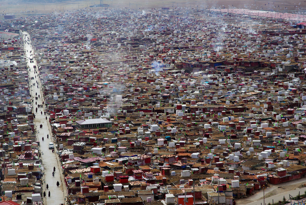 这样的小屋,单个看起来实在是不起眼,几间几十间也如此,但当它几千上万覆盖了整片山坡,那个场面就极为震撼。除了那些小屋,还有菜市,各类宗教用品店,僧侣服装店,自助银行,甚至电信营业部,公厕非常整洁还配有厕纸,这里已经俨然成为一个上万人居住的宗教小镇。