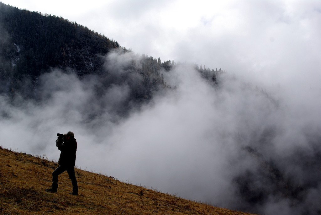 次日清晨,窗外依旧笼罩着一片浓雾,别说是远山,就是近处的树木都只是若隐若现。难道,今天就要在这样的浓雾中度过了?我心里暗求着,赶快掀起你的盖头吧。吃完早餐之后,眼见那片浓雾开始涌动,阳光从右侧隐隐约约地投射进来,我和老佐赶快拿上相机跑到外面去捕捉。