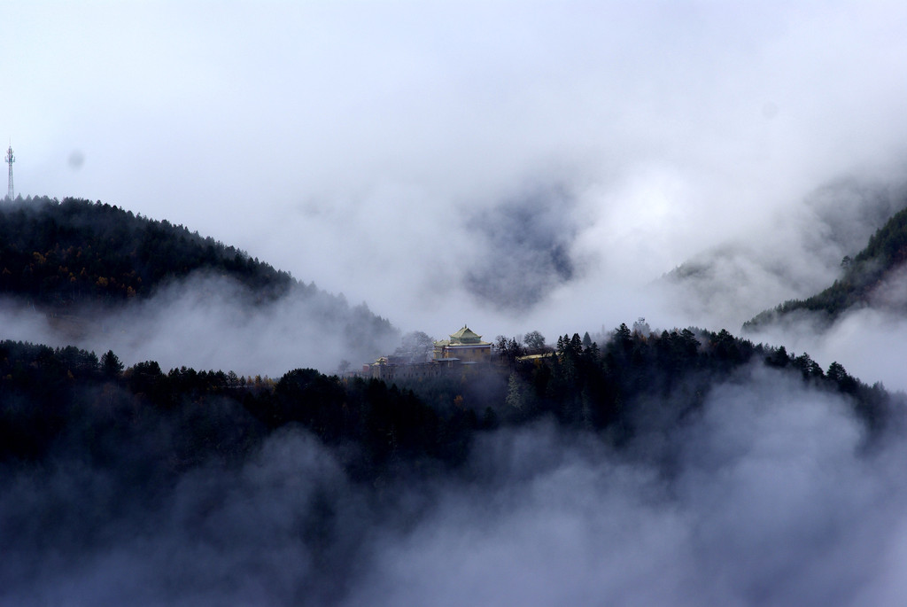 头顶上的云层正在逐渐退去露出了蓝天,左侧远方突然有巍峨的雪山从云雾中露出了一角,那冷峻的雪峰在阳光下熠熠生辉,而右侧的远方还是笼罩在云雾之中无法看清。最让人意想不到的是正对面这个位置,大约几百米开外与我们几乎同样高度的地方出现了一座横亘的山峰,一座金碧辉煌的寺庙在云雾缭绕的山顶上赫然显现。翻滚不停的云海时而把寺庙整个遮住,时而又把它下方的连绵不绝的森林掀起一角,这如梦似幻像海市蜃楼一般的景色美丽得让人怀疑自己的眼光。我们唯恐失去这美丽的一瞬间,兴奋得不停地摁动快门。