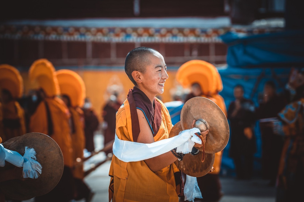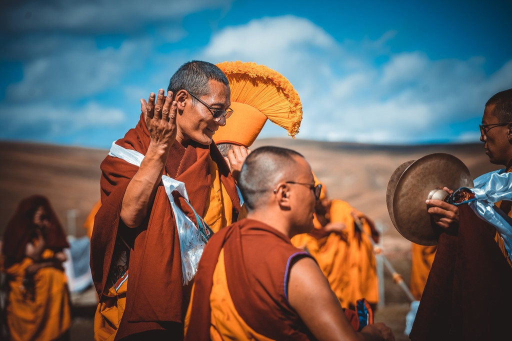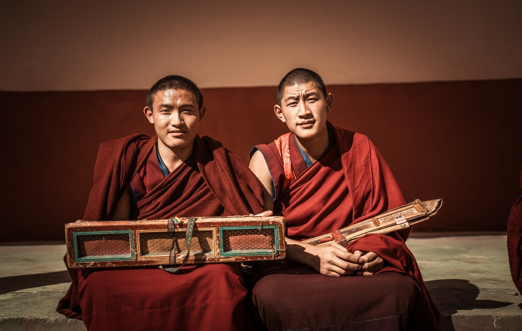 傍晚时分,僧人们结束了一天的修行,三两成群,有的踱步回休息处、有的在寺院外聊天,还有的在草坪上享受晚餐的快乐时光。