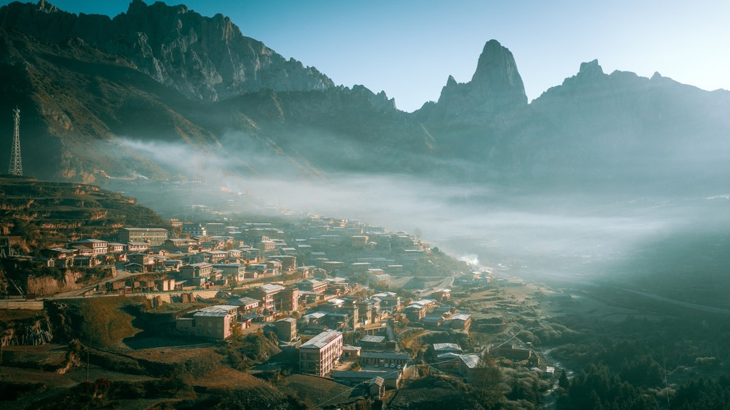 把镜头拉升到局部还更好看,在一个三面环山的山坡上,村子被袅袅的烟雾笼罩,一派静谧祥和,没有城市喧嚣,没有勾心斗角,有的只是“不知秦汉,无论魏晋”。
