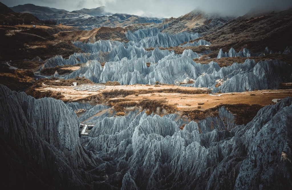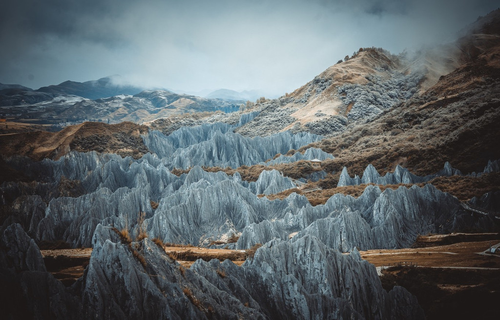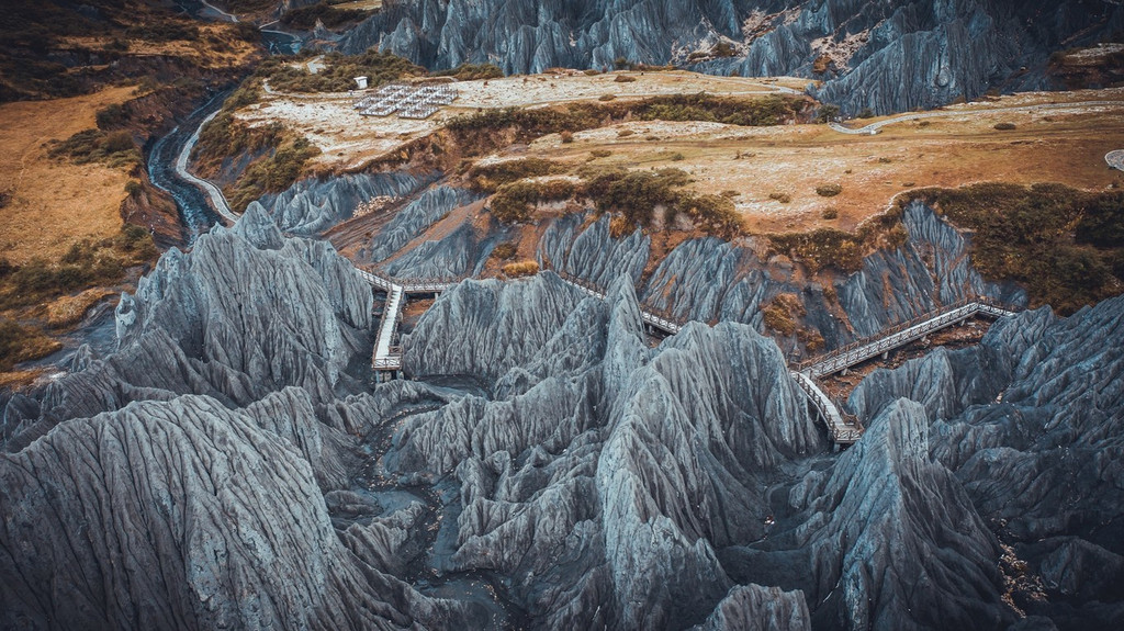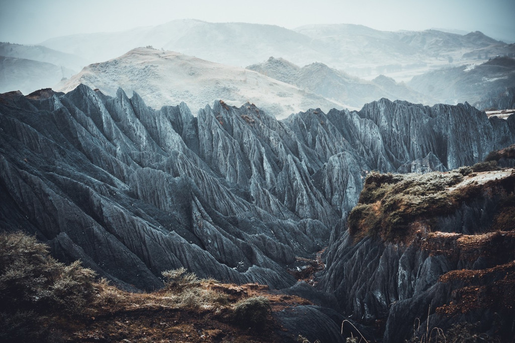 远看像煤灰,近看似墨粉。这种岩石较为软弱又含钙质,经过天然的氧化之后会在不同的季节呈现不同的颜色,甚至在一天之中也是呈多种颜色。阴雨天的时候山体颜色更深,云雾缭绕间颇具神秘感。