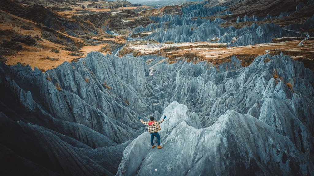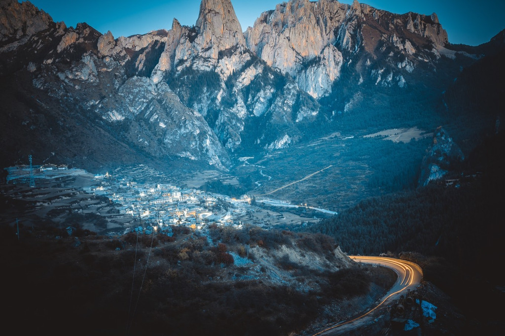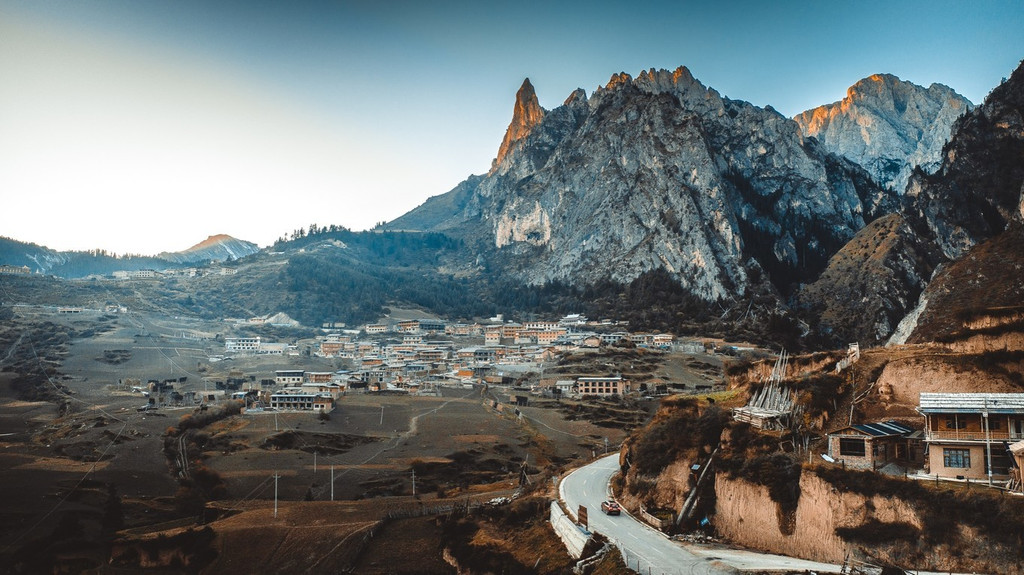 继续往上,经过达日村后有一块视野开阔的观景台,这里便是俯拍全村的最佳地点。可以看到整个村庄和后面奇幻岩壁的全貌,所有的房屋都是古老的木制房顶和土墙建筑,显得古朴安详,在崖壁包裹之下构成美丽的画卷。