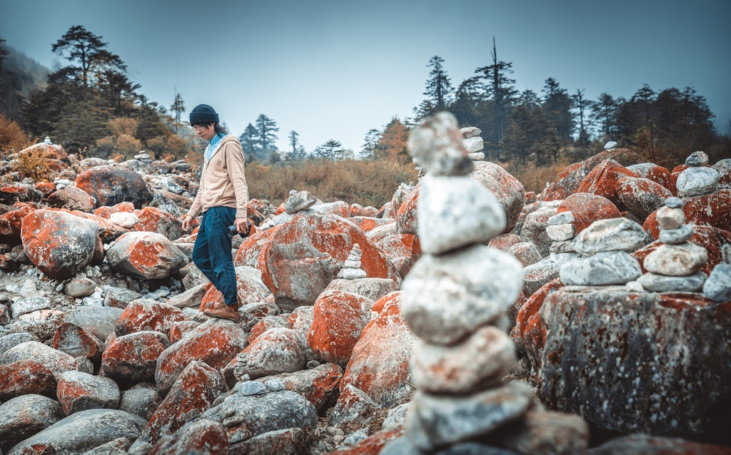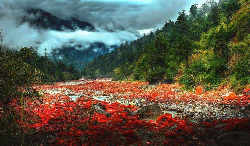 贡嘎雪山的东坡,雅家埂河的源头,河水潺潺,有一大片红色的石头被称为红石滩,红石自上而下绵延整个河谷。实际上,这些石头并不是本身红色,而是因为附着在岩石上的橘色藻植物颜色鲜红。