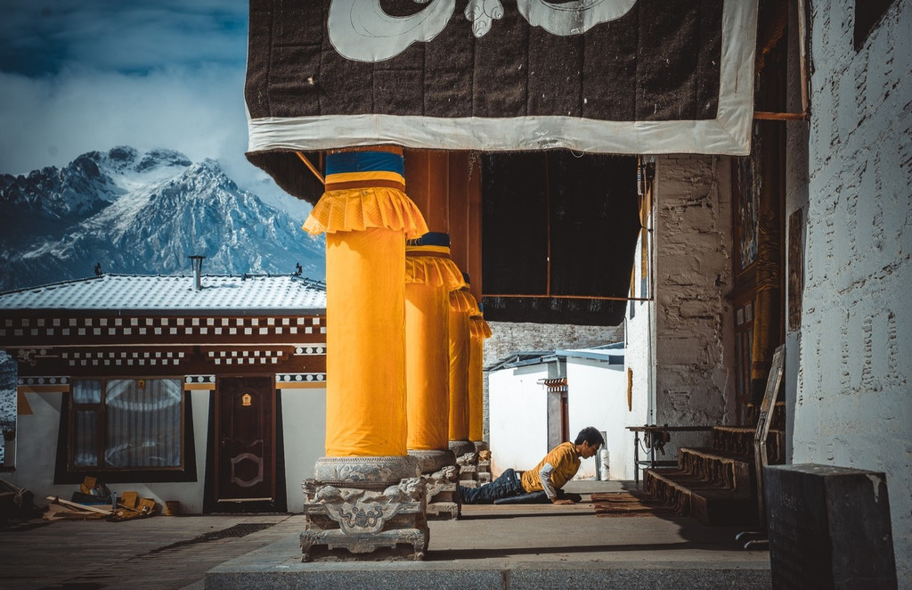 在朗依寺佛塔前佝偻却虔诚的老者背影;