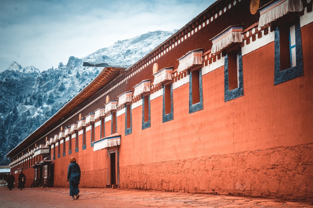屋顶覆盖了一层雪,在被金光包围的环境衬托下闪耀着圣洁的光芒。再向苍穹而望,蓝天白云显得分外的低,不远处有一座裸露的山峰,山上没有树也不长草,像神山一般呼应着郎木寺的圣殿。