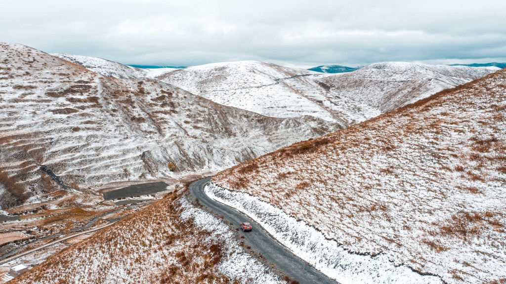 随着高度的爬升,路上的积雪越来越多,我们也把驾驶模式切换成了「雪地模式」,这样可以保证车辆拥有更平稳、更温柔的扭矩输出,减小在光滑的雪地上轮胎打滑的几率。