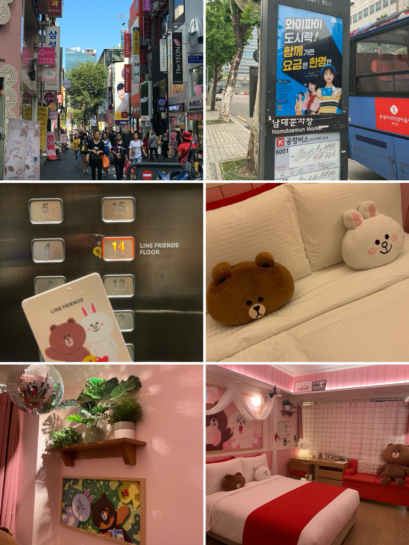 酒店位置特别好,走路到明洞新世界商场也就六七分钟,旁边街道里还有一大堆美食小店,离机场大巴站也是咫尺之遥。但喜普乐吉14层才有LINE主题房间,我们是提前几周(携程预定)才抢到的。当在拿着房卡进电梯,按下14层按钮的时候,周围有不少人投来艳羡的目光喔,嘿嘿。