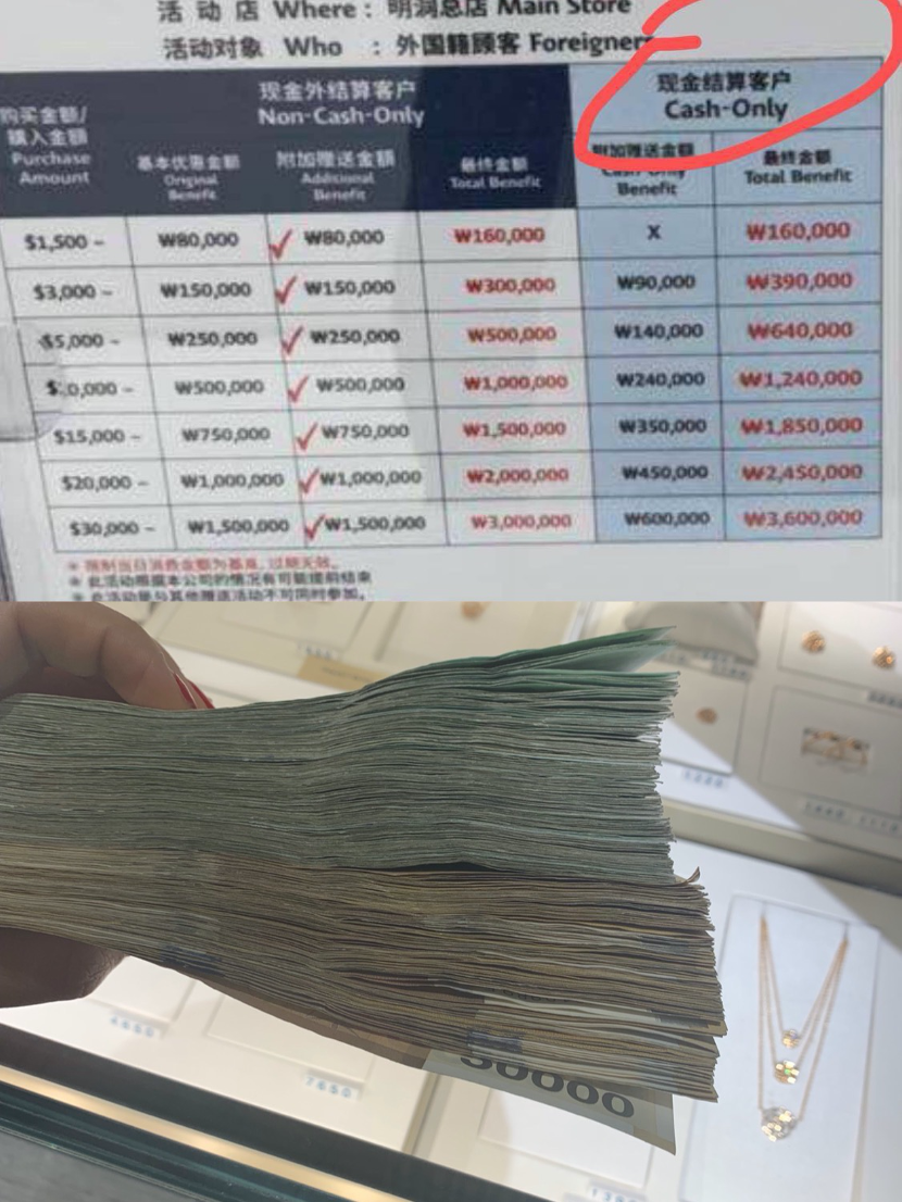 就拿我这次买的PIAGET戒指来说吧,明洞新世界免税店原价大概是880万韩币左右(大概合人民币52000元),如果参加免税店内的活动(包括银联、支付宝、微信之类的),最多可以节省100万韩币,相当于打了个八八折,听起来挺不错了;但我实际只花了660万韩币,还拿到了39万韩币的免税店消费卡(这个消费卡买其他东西还可以再返点),算下来几乎是打了七七折!