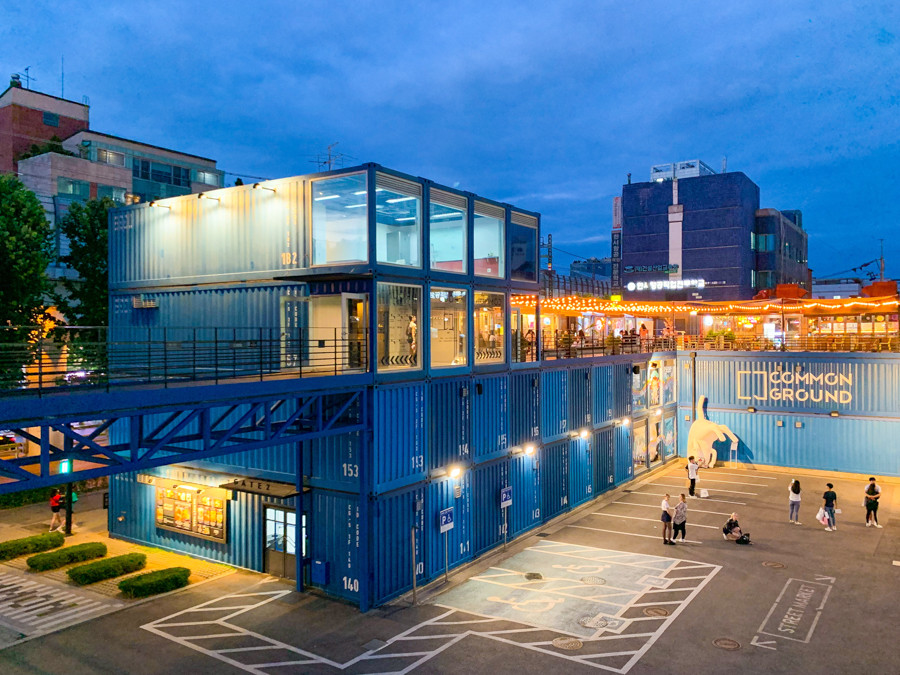 在首尔建大入口站,有一个神奇的地方,全是蓝色的“集装箱”,它就是时尚合集的common ground。这座有200个蓝色货柜拼合而成的商场,是目前全世界最大的货柜购物中心,蓝色的外表和独特的设计风格非常吸引人的眼球。这个韩国版“集装箱公园”占地56830,驻入了73个品牌十多家餐厅,是一个集服饰、鞋帽、餐饮为一体的时尚购物中心。