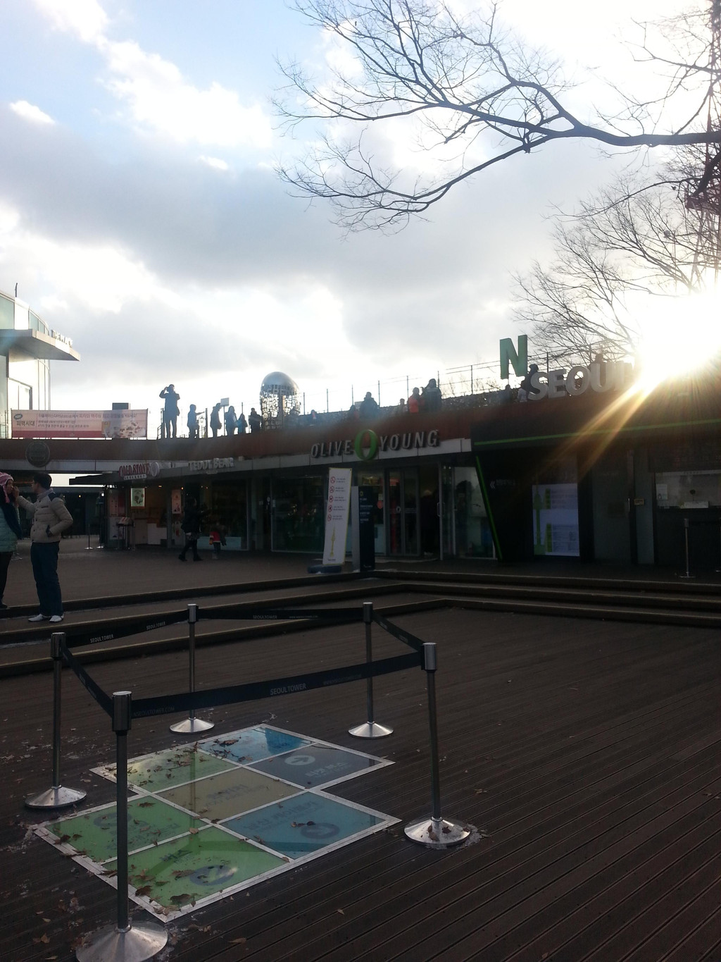 没办法,继续上山,折腾了半天,找到了公交车,但是方向不对的,后来看到韩国oba在等车,搭讪问了路,知道这个车其实是单行道的车,只有一个方向来回开。跟着oba上车了,到首尔塔的公交站下来,是底站也不用担心。盘旋了很长的一段路,才达到底站。下来爬了1个很陡很长的坡才上到了上面。