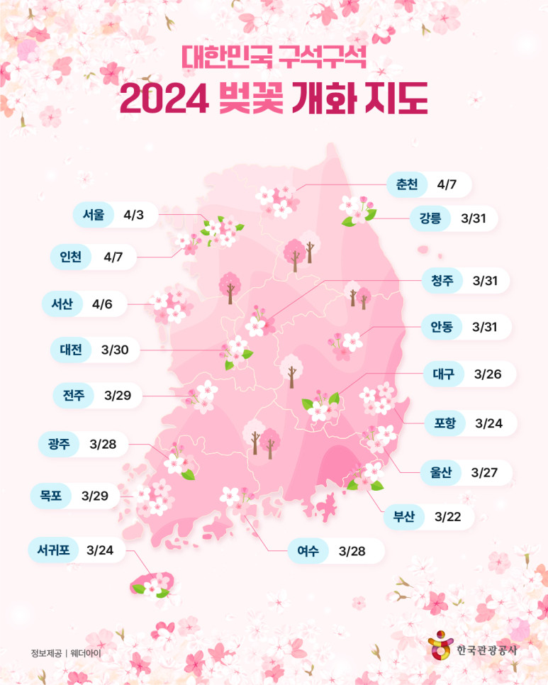 樱花最早盛开的济州岛预计在3月24日左右开花,首尔预计在4月3日左右开花。通常樱花在开花一周后达到顶峰,考虑到这点,首尔则为4月10日之后。届时所有樱花树都开满粉粉的樱花,是赏樱的最佳时机。