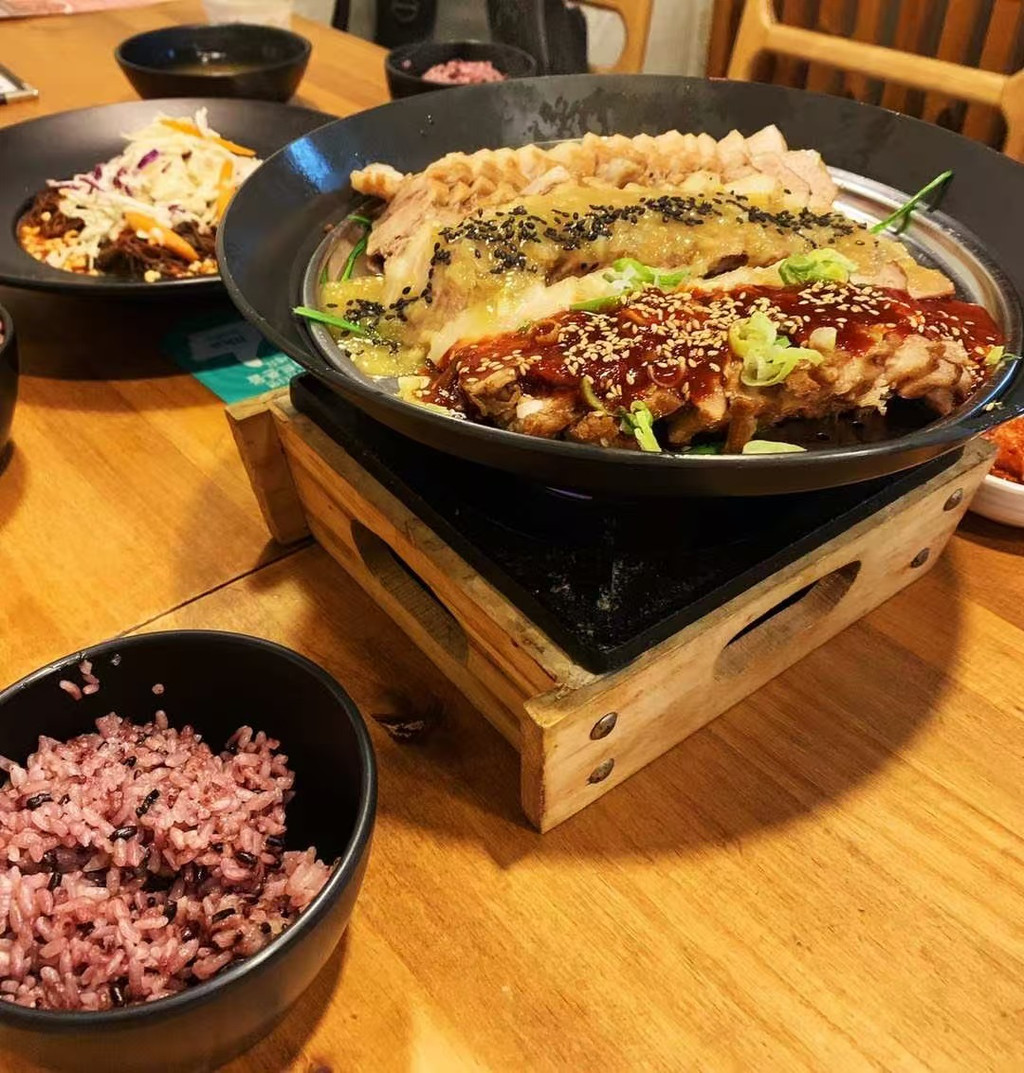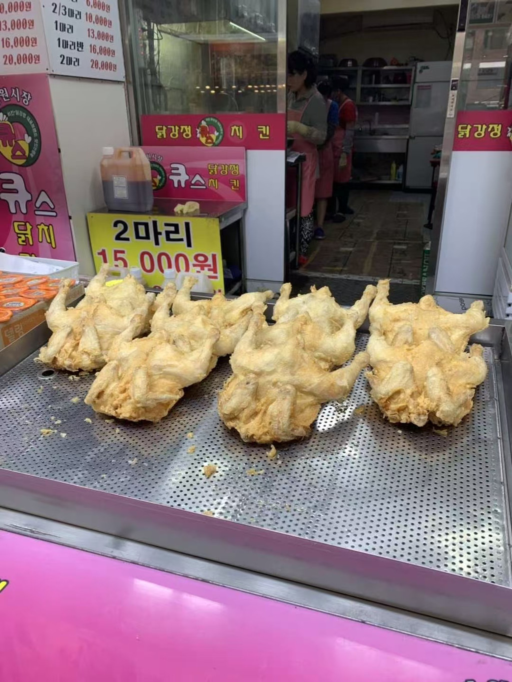 简单休整后,我们又原路返回(真的好累吖),网上找了一家口碑很好的店,好好地慰劳一下自己,参鸡汤走起....(一锅一只鸡,鸡肉里面包裹着糯米,味道不错,当然也是随机附送辣椒和蒜头,泡菜,我一个人吃不完一个,分量有点大,女生的话,建议真的是两人一锅,然后再点其它的好点。这边的炸鸡也确实不错,很脆口,反正在韩国的每一顿我都觉得好好吃)