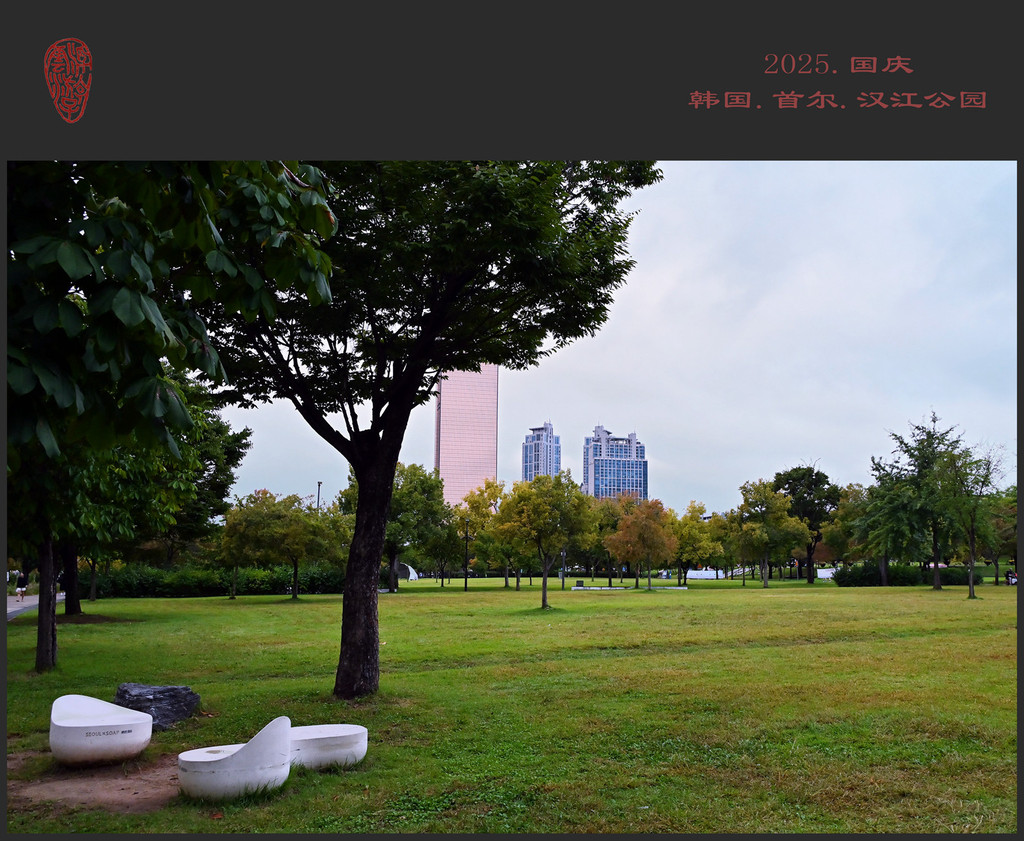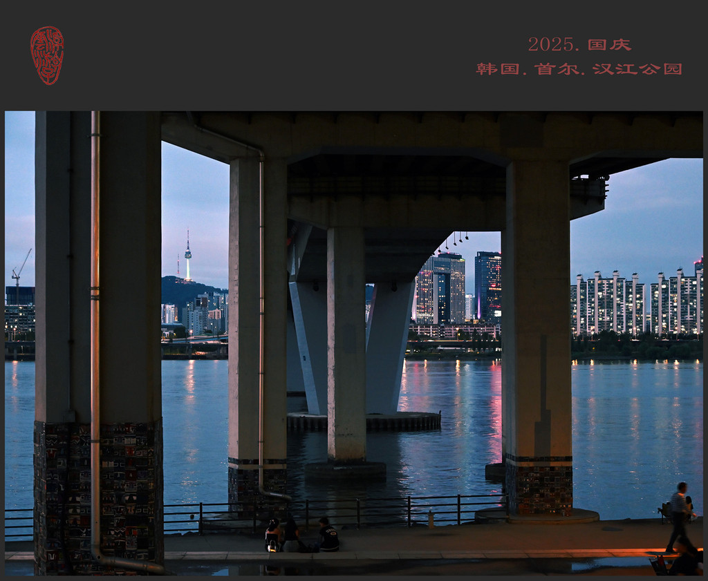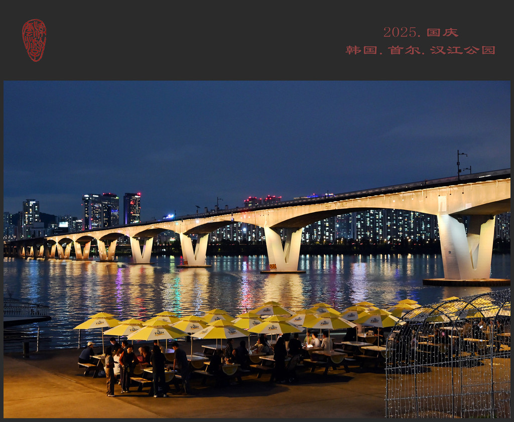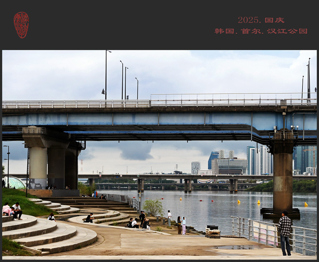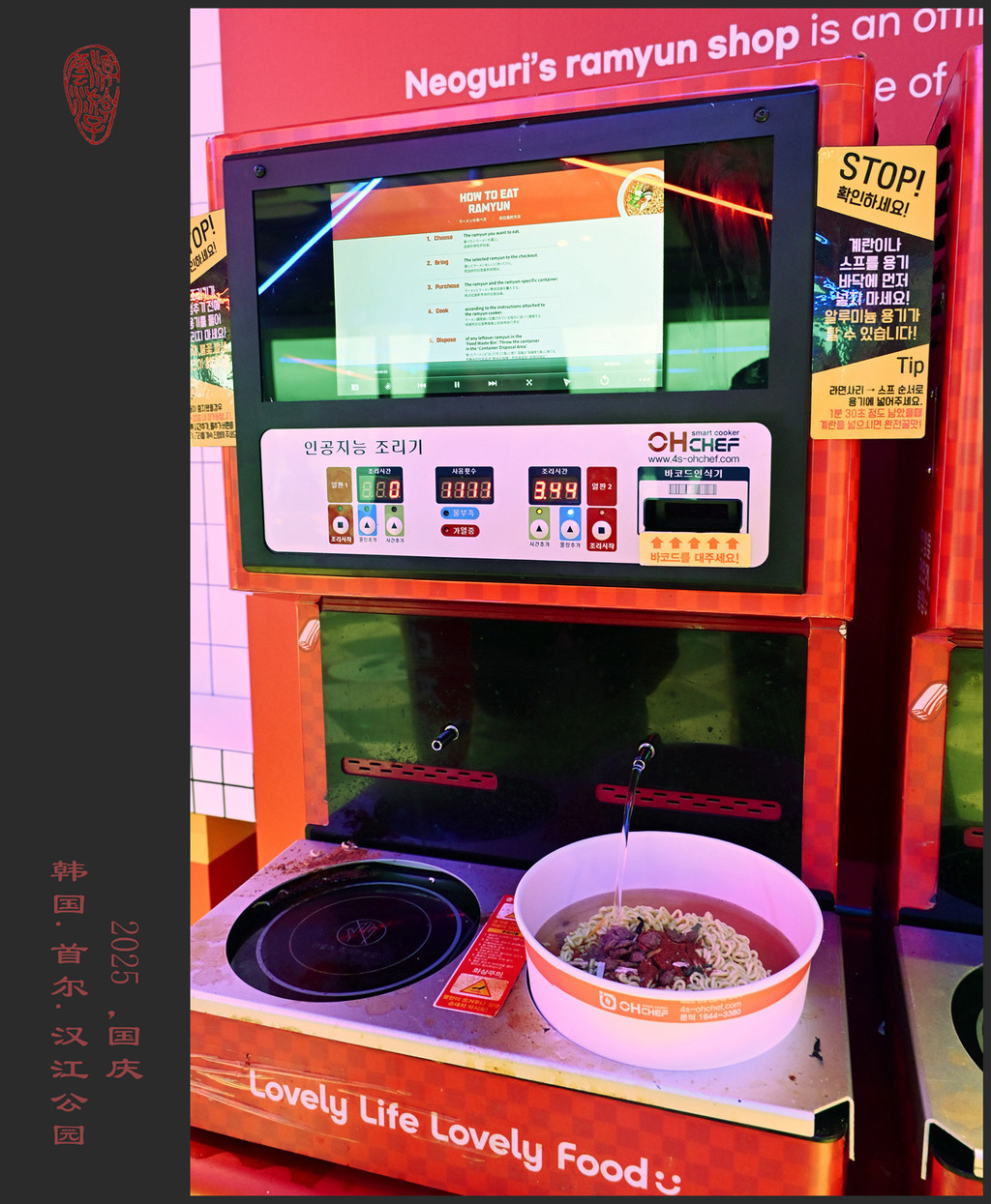 汉江公园则是临着汉江的市民公园,汉江沿岸有好几个汉江公园,这次去的是汝矣岛汉江公园。江岸草坪绿地连绵,很多韩国人铺着野餐垫或搭起帐篷,悠闲自在。江边有个星巴克,自然是无敌江景,但这里更有意思的体验是蹲在江边吃泡面。超市的泡面连着特制餐盒一起售卖,然后在自动泡面机上按提示操作,四分钟就可以煮好一碗热气腾腾的韩国泡面,端到江边找个地方坐下来吃,也算入乡随俗。汝矣岛汉江公园是看日落的绝佳所在,只可惜天公不作美,只能等华灯初上,看看江上大桥和对岸城市的迷离灯光了。