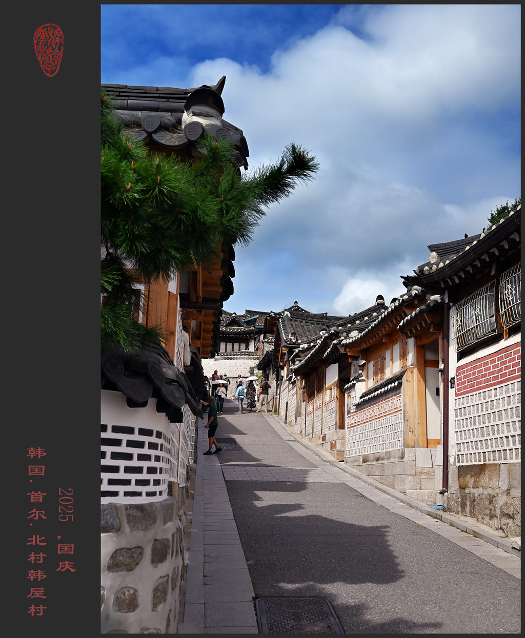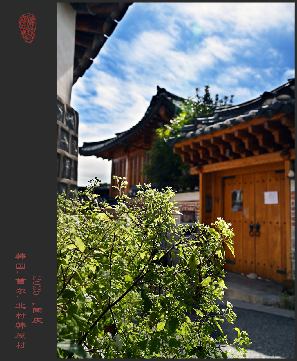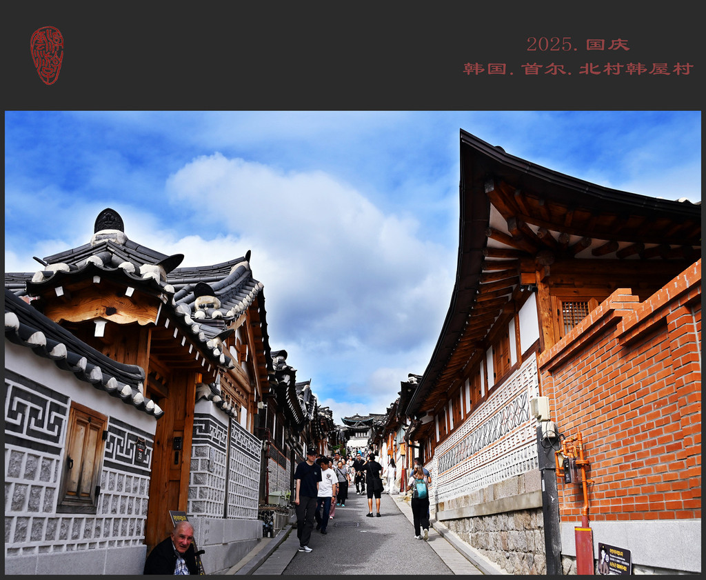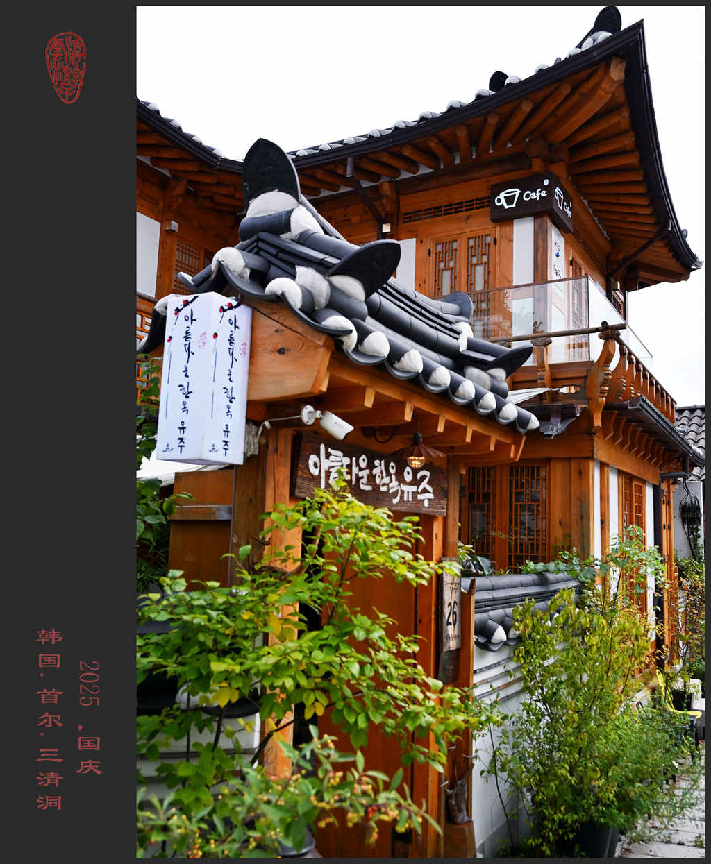 离景福宫不远就是三清洞文化街和北村韩屋村,这里也是保存完好又最具代表性的韩国民居。部分韩屋作为咖啡馆或茶馆开放营业,可以进去消费,大多数依然有住户。因此整个韩屋村只有下午五点前可参观,晚上禁止打扰,有很多标识以及志愿者在提示游客小声游览。沿着山坡而上的几条街巷两边都是风格独特的韩屋,砖石墙基、图案鲜明的外墙和圆木窗户房梁,层层叠叠,连成一片,身着韩服的游客在屋前廊下拍照,非常和谐鲜明的高丽风情。