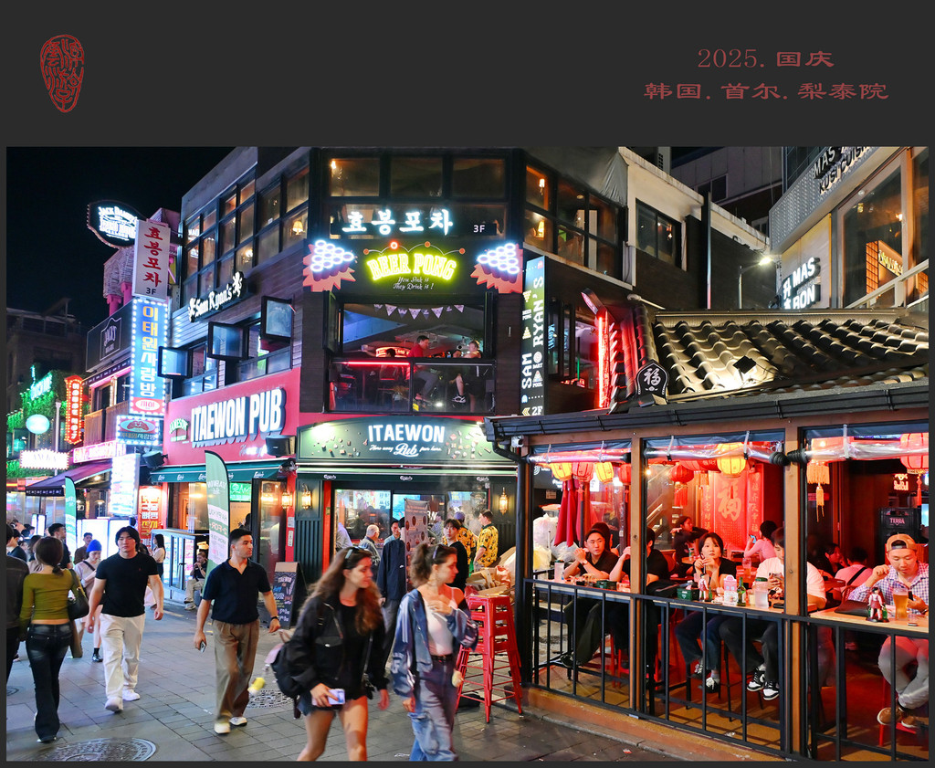 不过夜市还是热闹的,到的当晚就去明洞夜市,门庭若市,人潮汹涌,当地特色的小吃摊摆满了街道,让人食欲大动。还有梨泰院酒吧街,临街大开着的窗户,让街上来往的行人和窗边喝酒的男女没有距离,喧闹的声浪充斥着屋里屋外的每个空间。白天还路过仁寺洞,打卡了东大门,仁寺洞就是一条布满餐饮茶馆、创意店铺、旅游纪念的步行商业街;东大门市场假期关闭了,只看了一眼充满形式感的 DDP 设计广场和留存东大门遗址的文化公园。