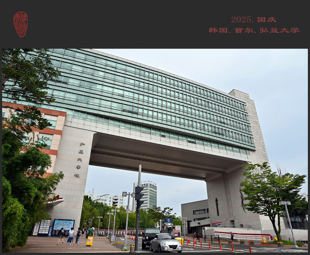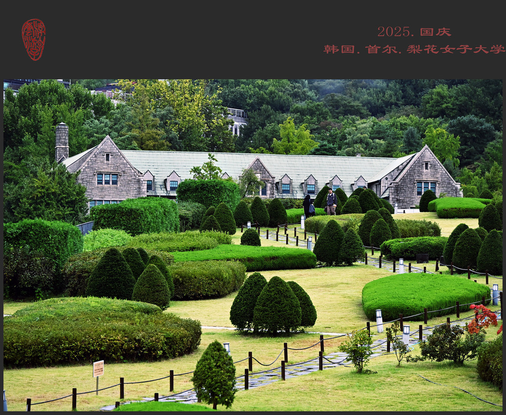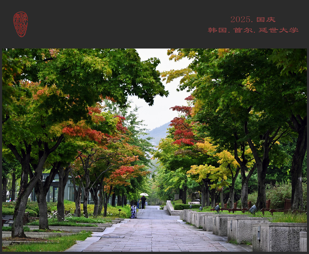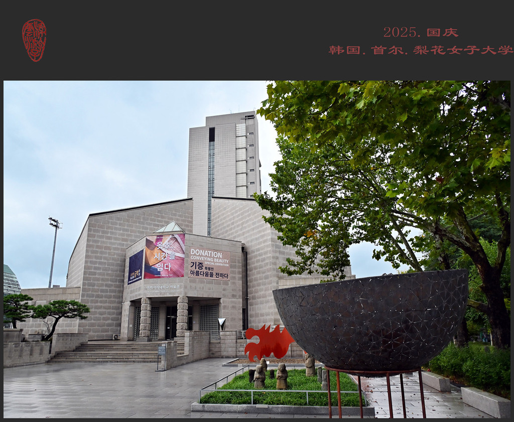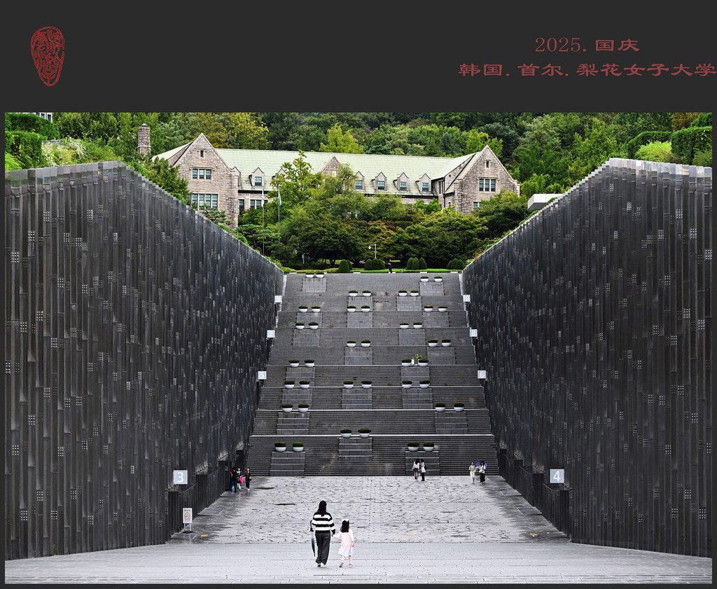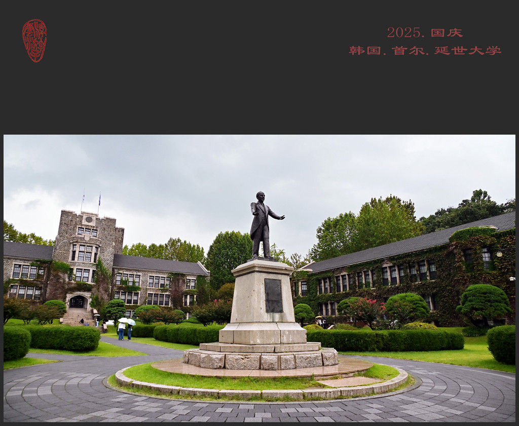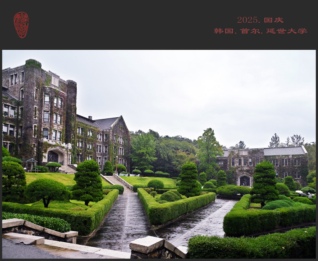几所大学也是韩国旅游的打卡之地,梨花女子大学和延世大学都有140多年的历史,但是延世大学保留了更多古建筑,校园中心绿化带周围环绕着欧式教学楼,墙上布满了爬山藤,很像欧洲古堡的建筑格局。延世大学面积很大,校门口有一条长长的中央大道,校园后还有大片树木茂盛的荒地和林荫道。梨花女子大学则小一些,其亮点是下沉式图书馆,古建筑混杂在后来修建的教学楼中,倒不那么突出了。梨花女大和延世大学离得很近,步行几分钟就到了,假期的校园里几乎没人,阴雨天气游客也很少,走在校园里十分清净和舒适。