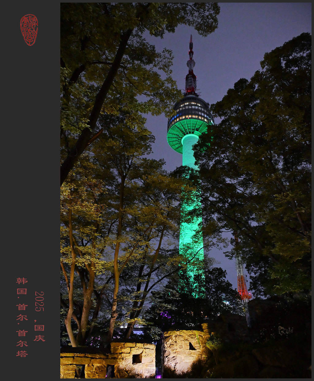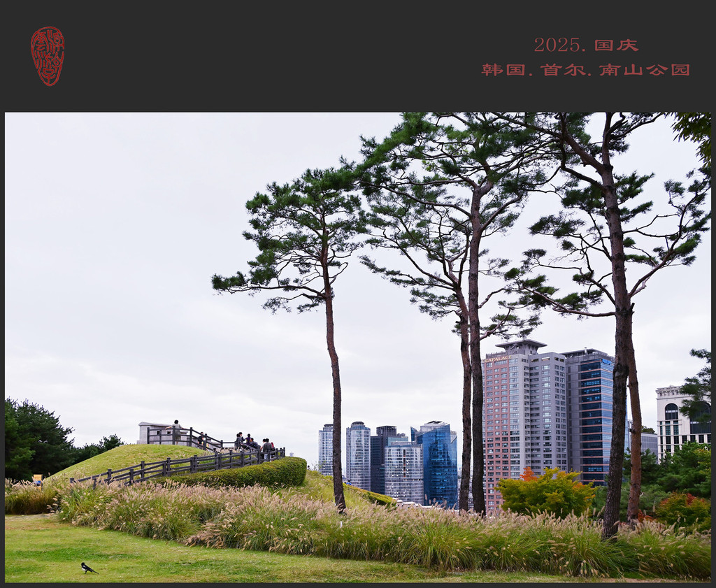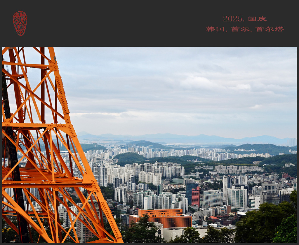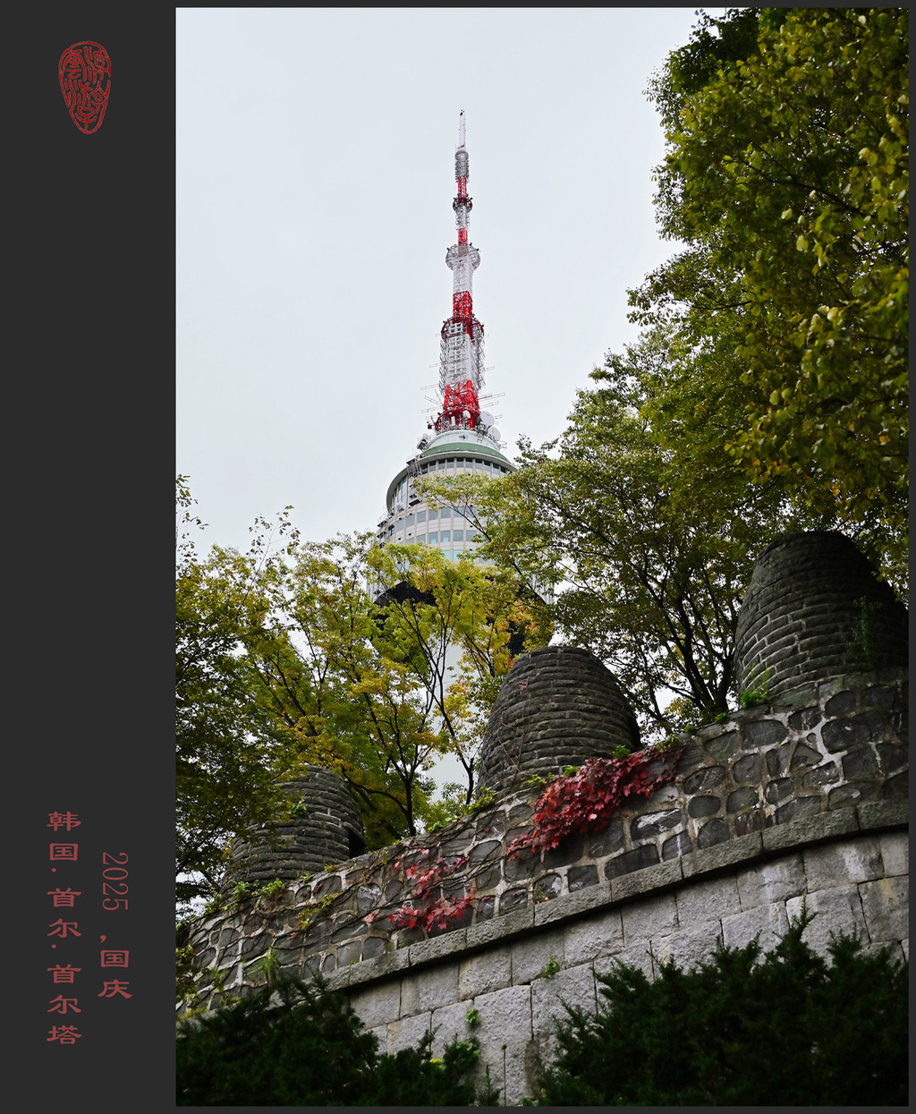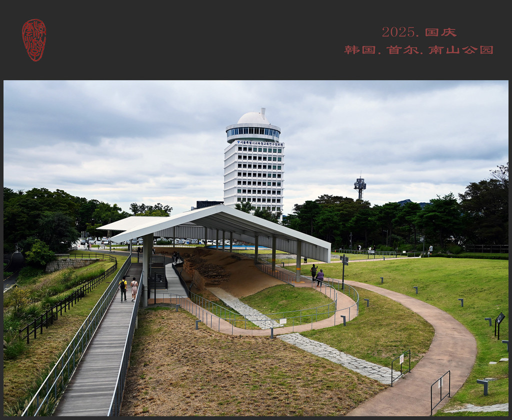 首尔塔总高236米,但是位于中间的观景层处标高380米,这是算上了南山的高度。首尔塔建在南山顶上,南山公园依山而建,是首尔市区的一个市民公园,据说是《来自星星的你》等多部韩剧的拍摄地。公园有一个旧朝鲜神宫遗址,只剩下一些地台基座了。沿着步道上山,一路环境优美,植被茂盛,随处可以远眺城市景观。