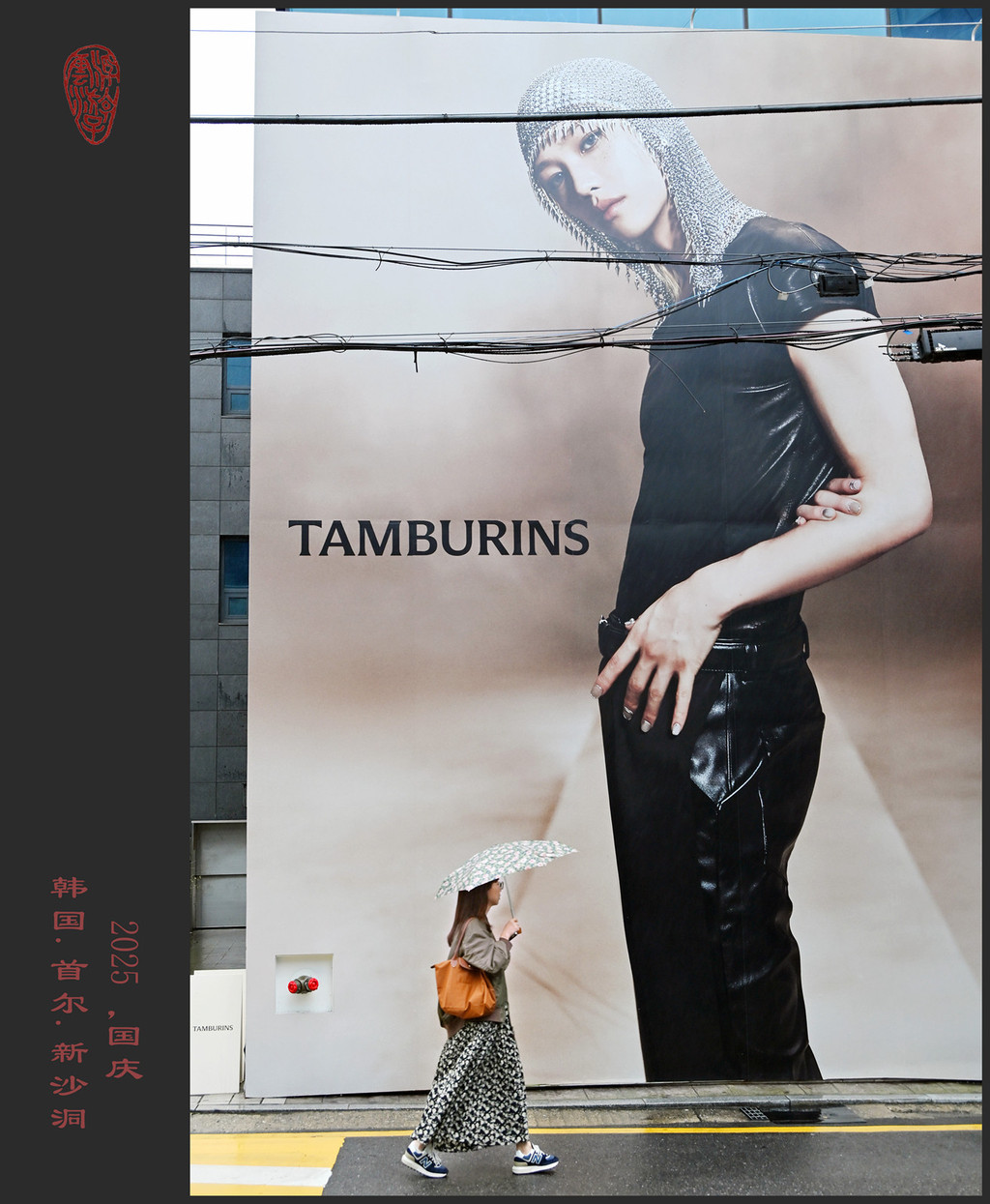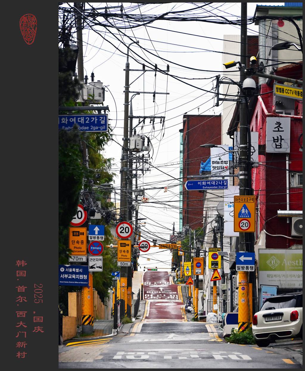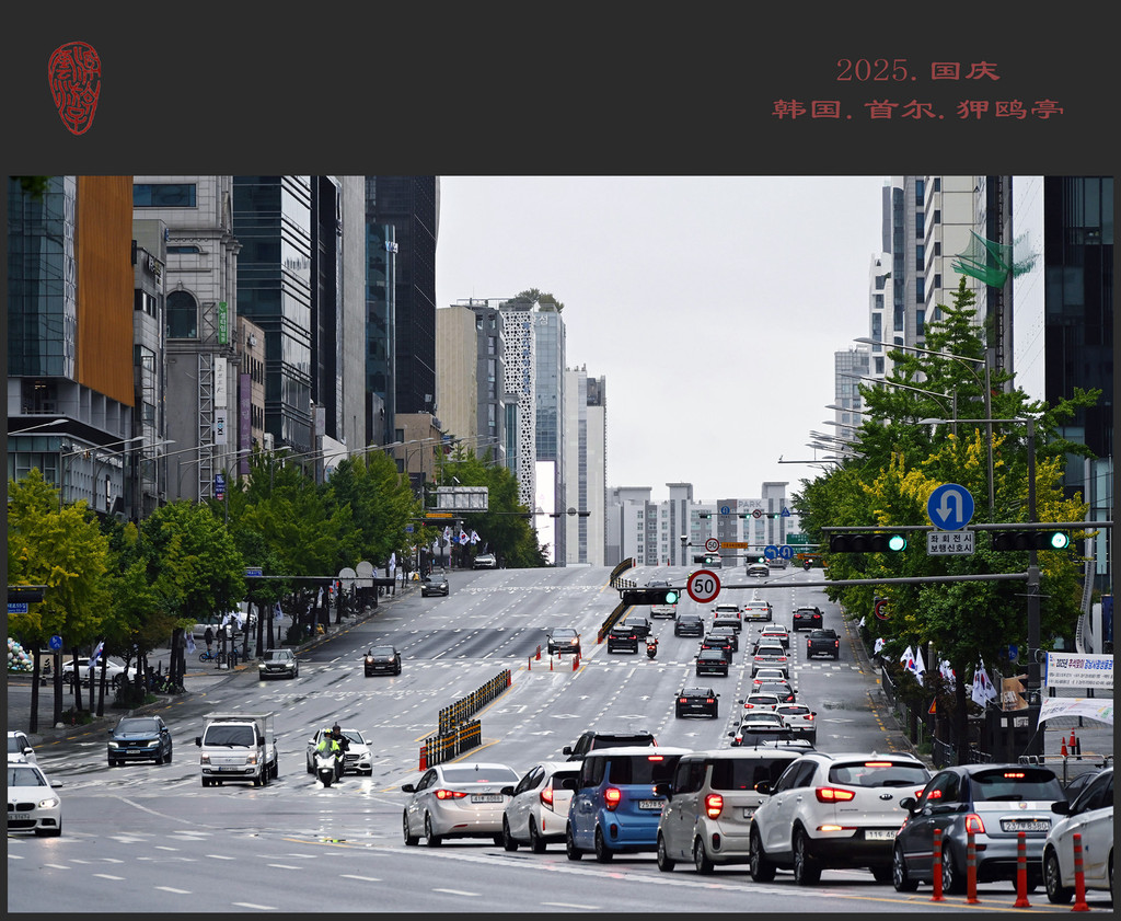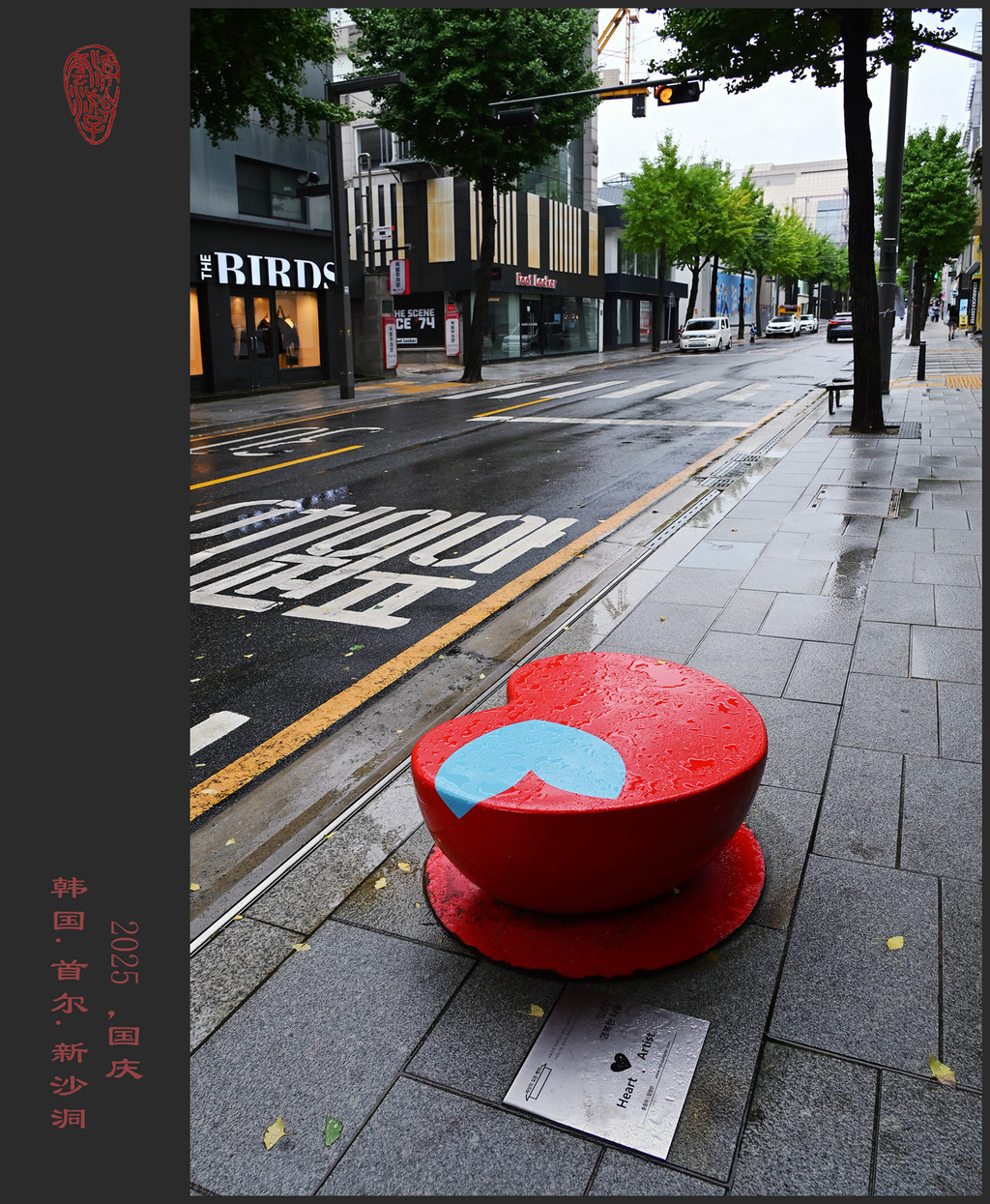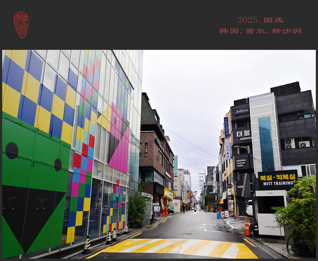 弘大购物街是年轻人的天堂,新沙洞、狎鸥亭则是时尚潮牌、国际大牌和美容整型的集中地,但在我看来不过是布满商铺的普通街道。也慕名去打卡了新沙洞林荫道的巨型海报,路过了开在狎鸥亭小街巷里的LV专卖店,但绝大多数店铺都关门闭户,让阴雨的街道显得冷清萧瑟。这在国内是无法想象的,就算是春节,商业场所也一样人潮涌动,韩国居然过个中秋就不做生意了,这也确实有点老牌资本主义国家的做派。