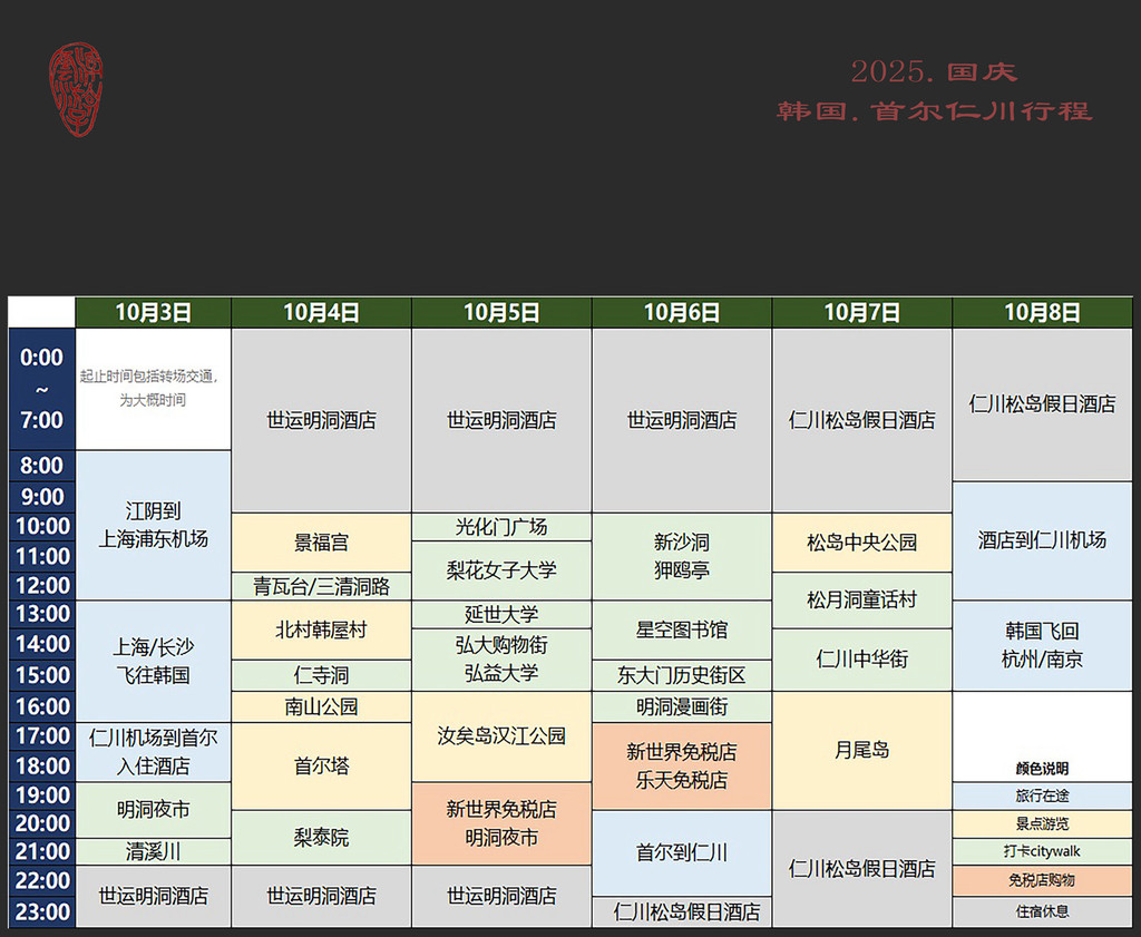 一直习惯在某窝上找景点做路书,但最近几次都发现信息陈旧,攻略潦草,旅游手册都是十多年前的了,现在大家都在小某书上分享旅行经验,某音上也资源丰富。刷了一晚上某音,很快草拟了几天的行程,首尔一般安排三天,还有两天去釜山或者济州。不过赶上韩国也过中秋节,首尔去釜山的机票和火车票早就订完,只能改成首尔旁边的仁川。订好往返机票和在韩酒店,就万事具备了。
