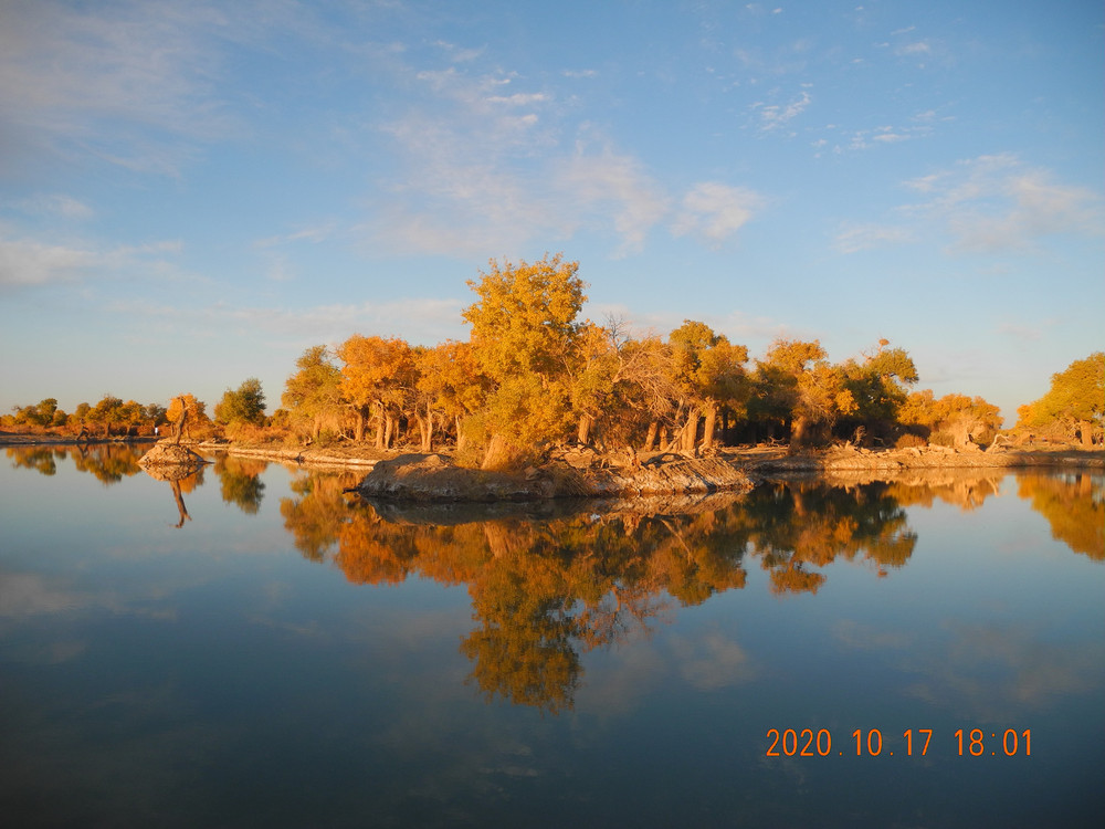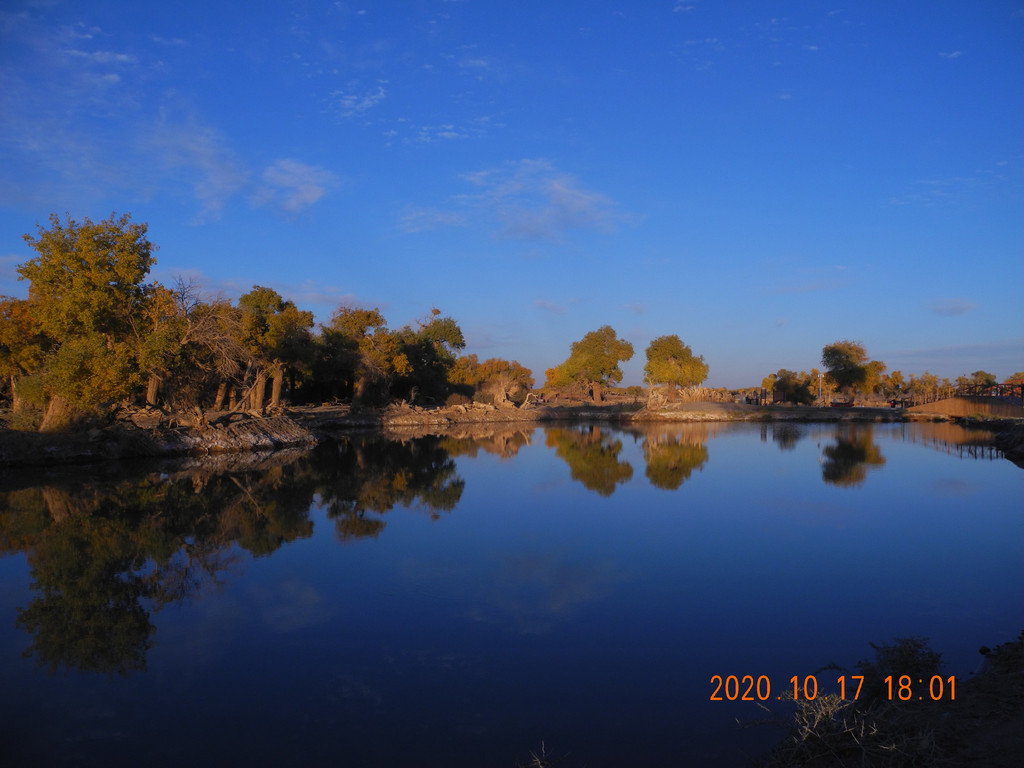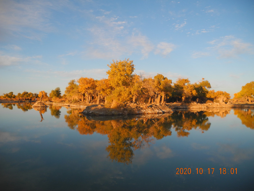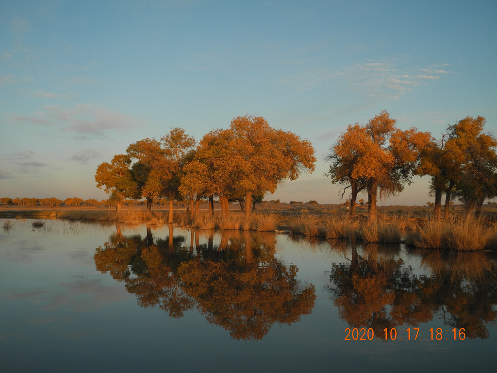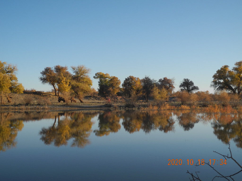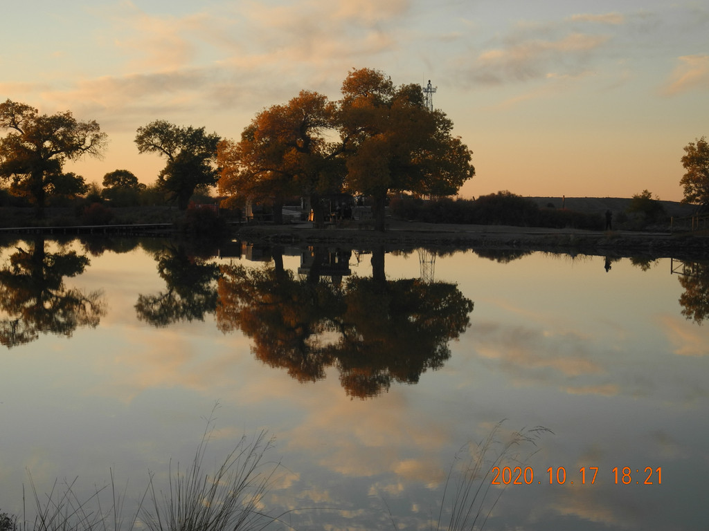 今天风大,湖面有些涟漪,倒影出的胡杨有丝绸的感觉。这两天胡杨看多了,兴趣不是太大了。