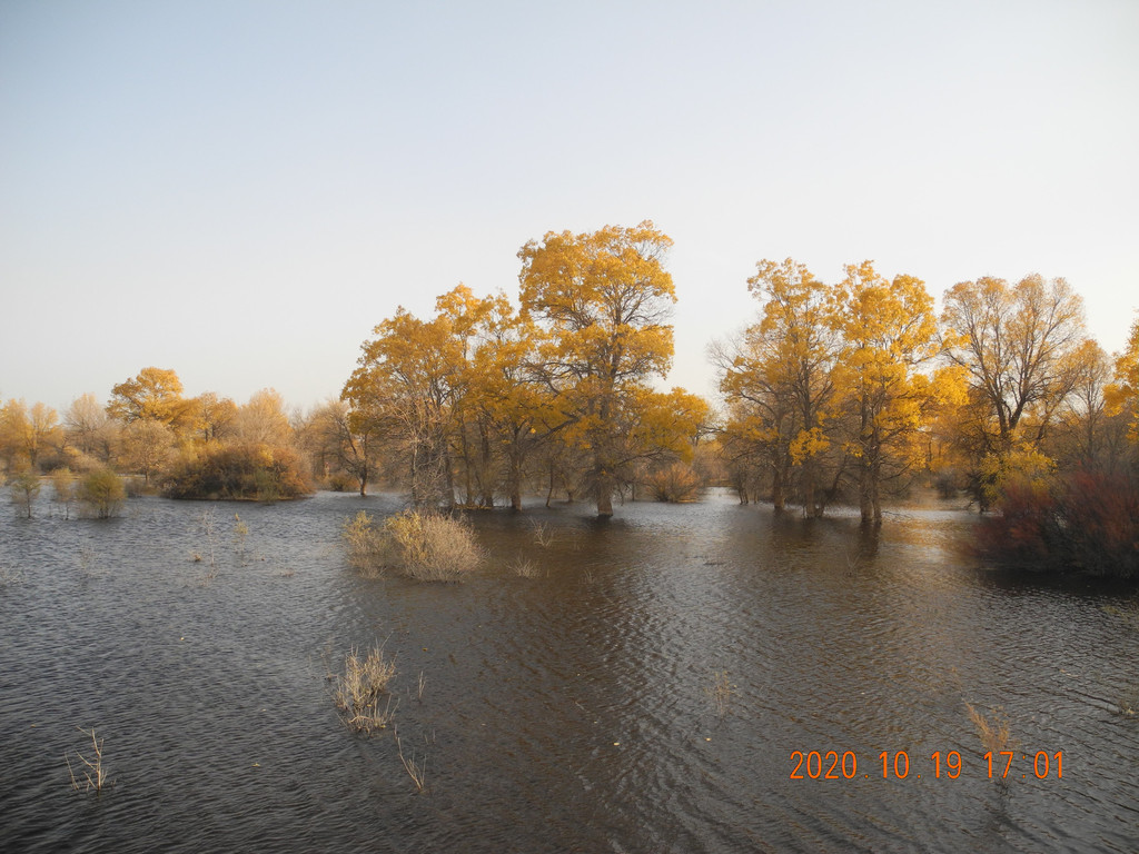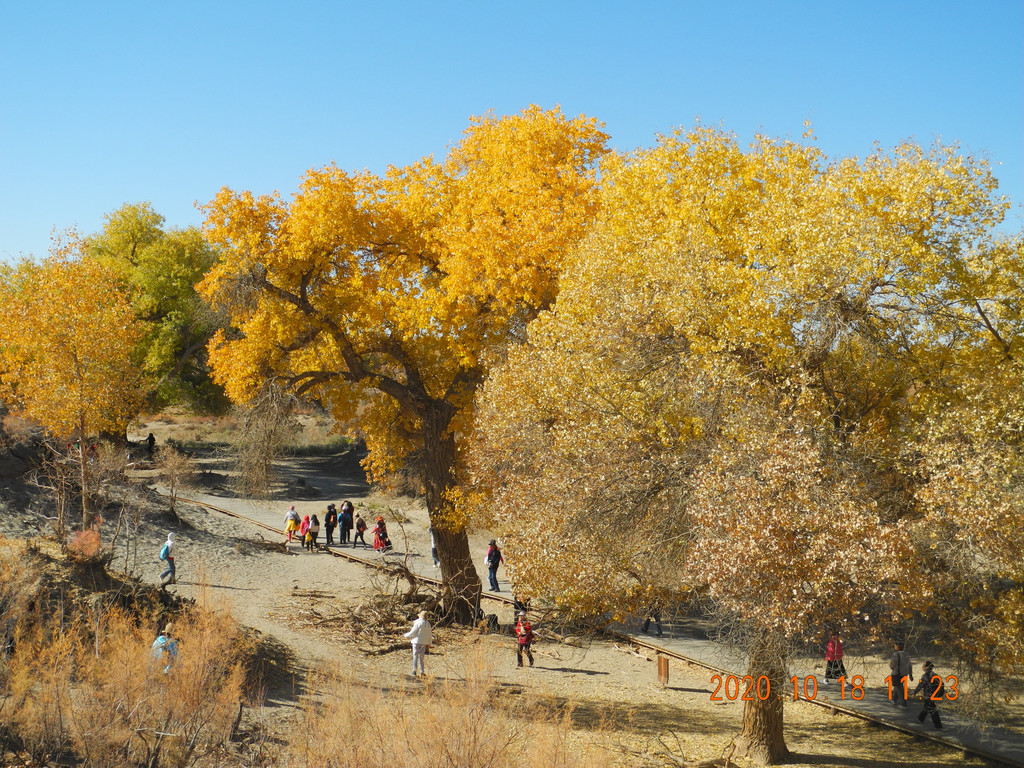 弱水金沙的胡杨林还不错,只是人太多,每张照片里都是人头,还有光线也不好。“七彩林”风光。