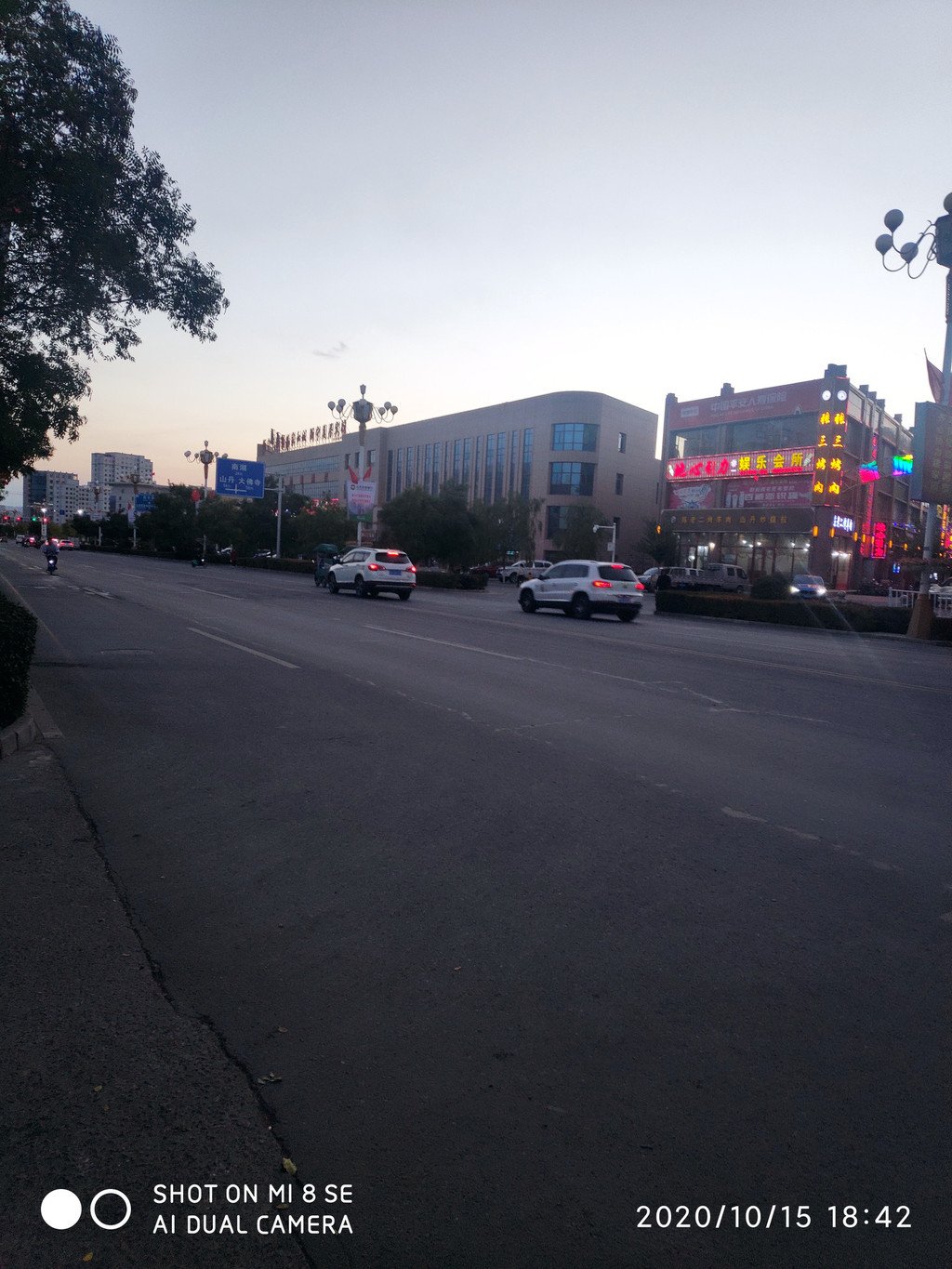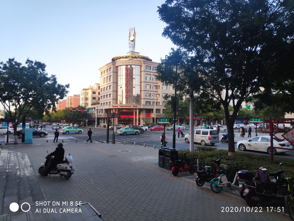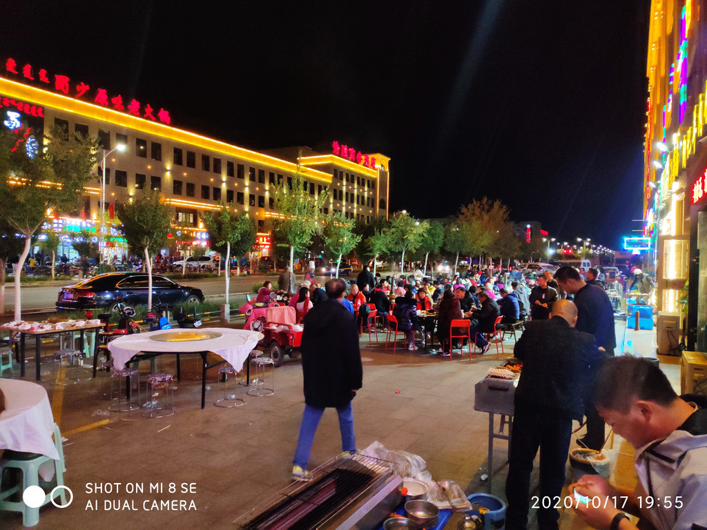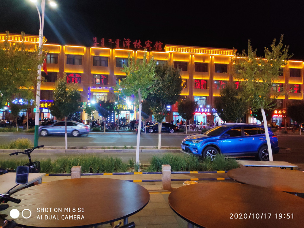 在一片满足声中大伙晃着手机,相机缓步出门。外面已经天暗了,顺着车流来到达来呼布镇,看过介绍,整个达镇才3万多人,一个胡杨季得把小镇给压塌了。跟着导航,居然让我们车顺着人行道逆向到达酒店门口,我真是太佩服“高德”。人行道都能导航。登记入住,明天早起一天都是看胡杨林。放好行李下楼。小镇现在是旺季,马路上人来人往,排挡小吃应有尽有。