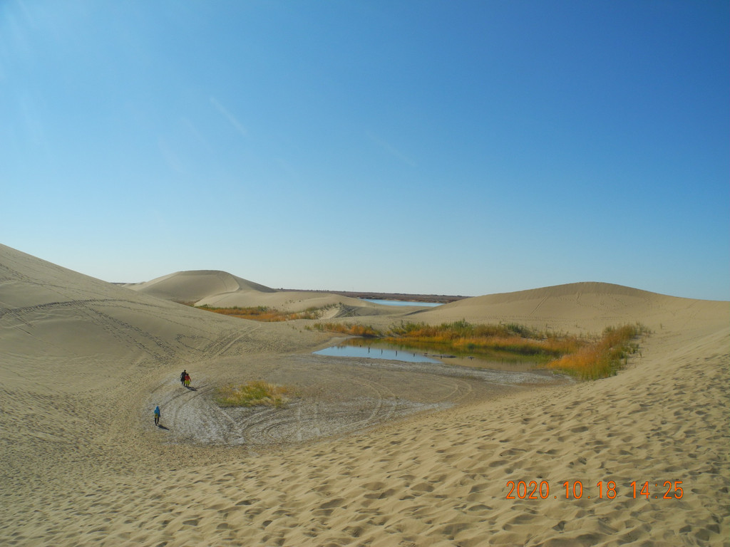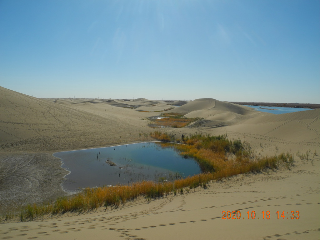 高耸的沙山,巴丹吉林沙漠地下水丰富,孕育出无数的绿洲,待我们爬上沙山后下面是一汪汪的湖泊,大自然真是神奇,沙漠与湖泊共生。
