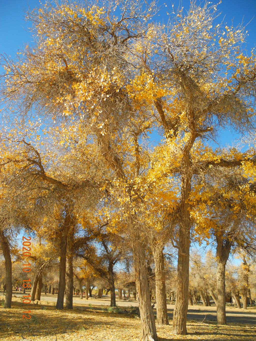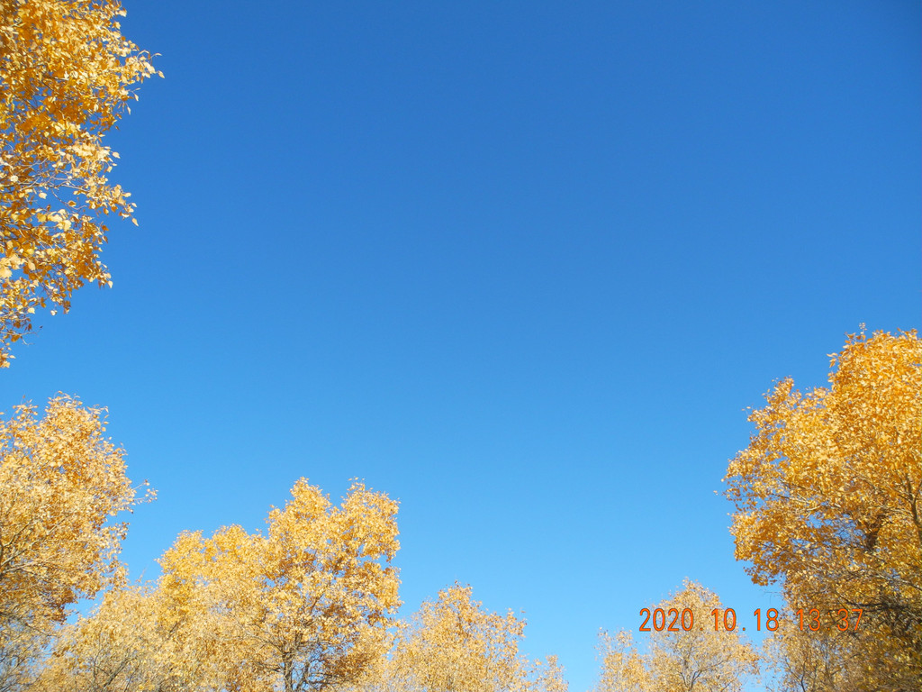 金色的胡杨叶衬着蓝天,也是不错的,只是树叶枯萎