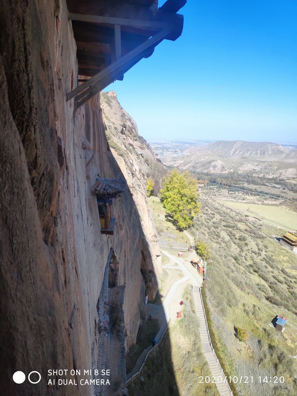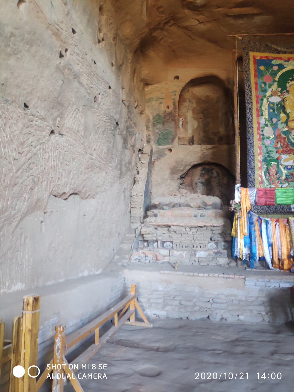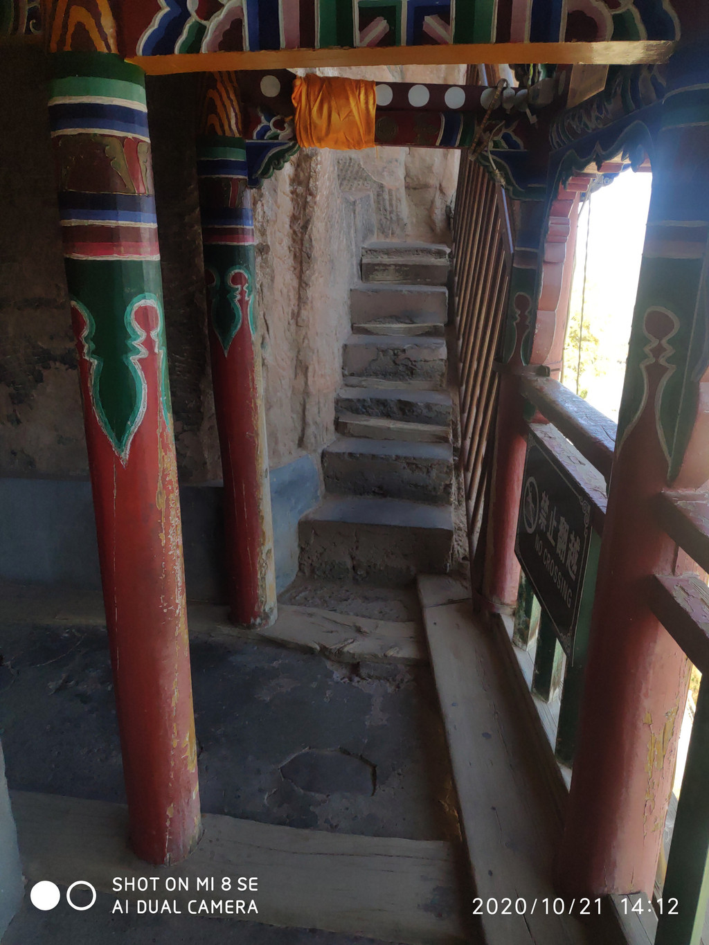 这扇小门就是攀登洞窟的楼梯,旺季时都要排队,现在都没人整个洞窟里就我和同事及张掖来的一对情侣,还有3位同事没上去,这两天路走多了,膝盖都受不了了。