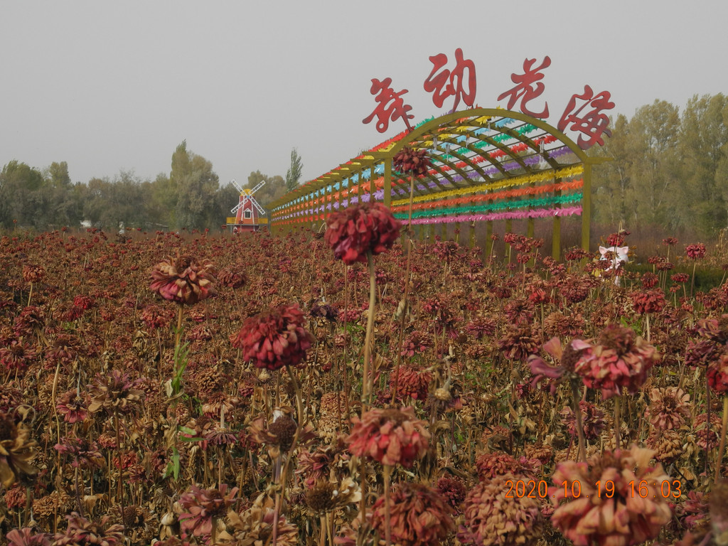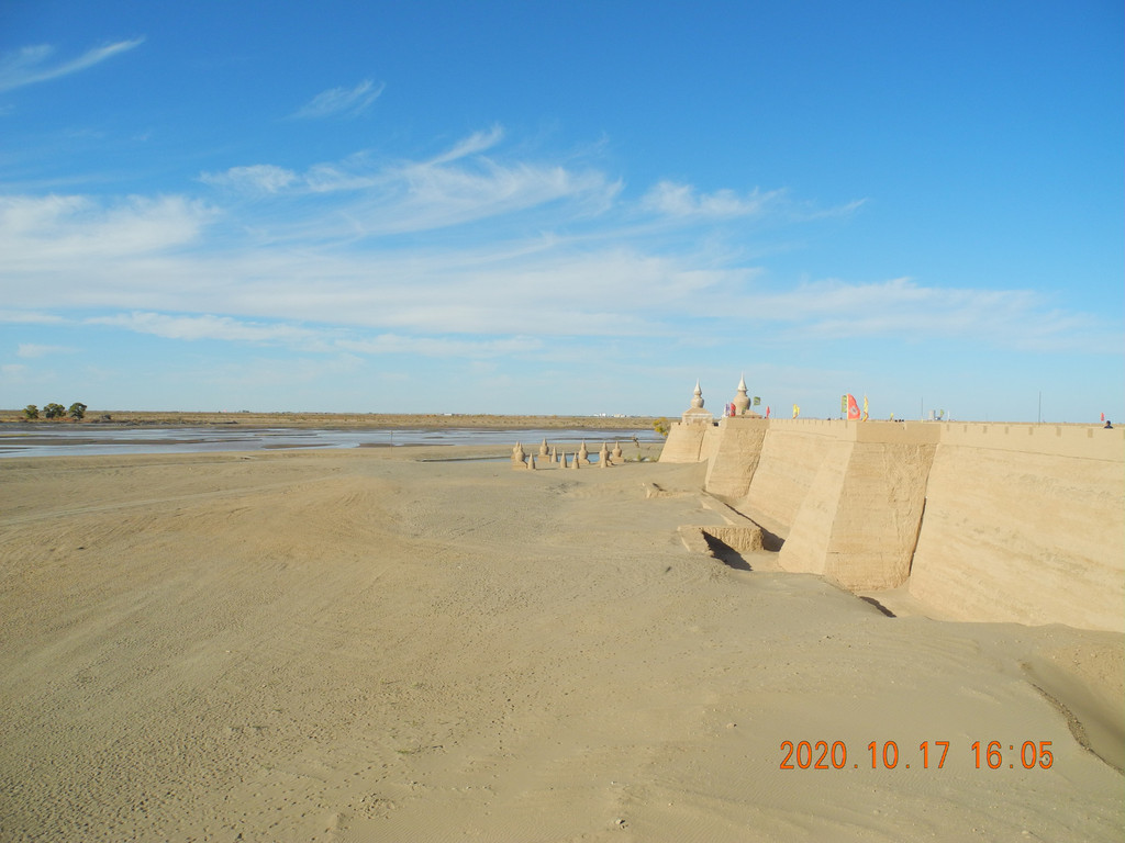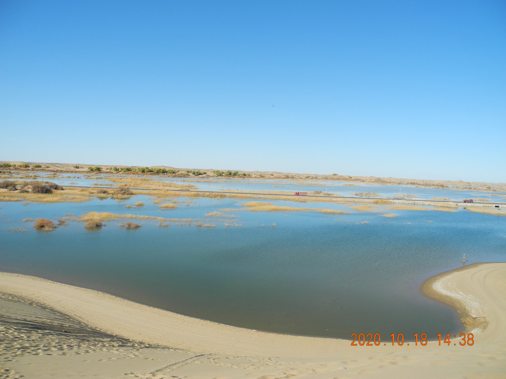 路边荒滩,排水中。酒航路上双向两车道,大车,小车,大巴川流不息,看样子进额济纳的人还真不少,大卡车一般都是奔策克边境去的。5个多小时路程,下午2点左右看到前面有条岔路,一头奔达来呼布,一头奔黑城遗址,但还指向弱水金沙方向也在达来呼布的方向,我们也没注意,继续向达来呼布方向开,想先进酒店放好行李再出来。开了没几分钟路边直接就是弱水金沙,怪树林的广告,跟我们做的攻略不一样啊,大家想着既然都到门口了进去逛一圈吧。停车买票。连区间车门票200,涨价了?再仔细看看。现在是4个景区都捆绑在一起了,弱水胡杨林,凤凰林,黑水古城,怪树林。4个景点打包了然后再以区间车串联,本来是弱水金沙是单独的,黑城遗址和怪树林是一起的。但现在黑城遗址不能去了,黑水古城只是个仿造的景点。现在等于一揽子把这些景点都囊括了。