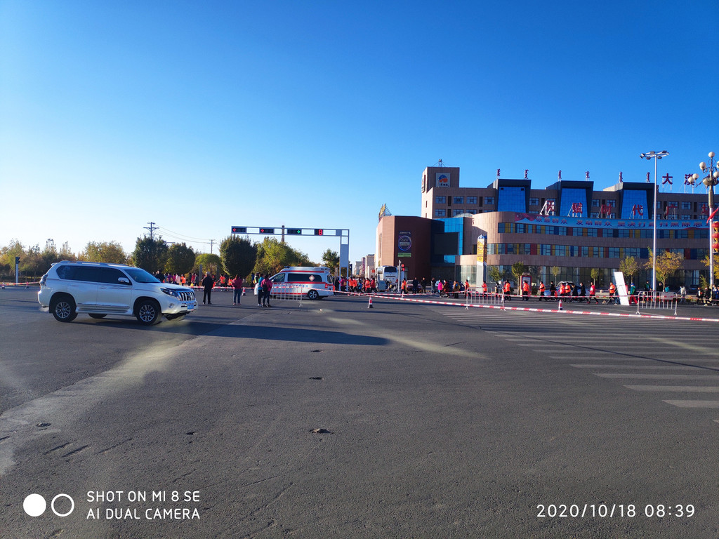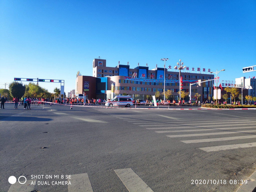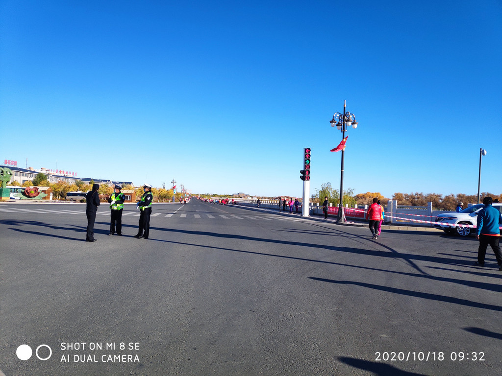 今天还碰上马拉松比赛,沿着胡杨林大道开跑。