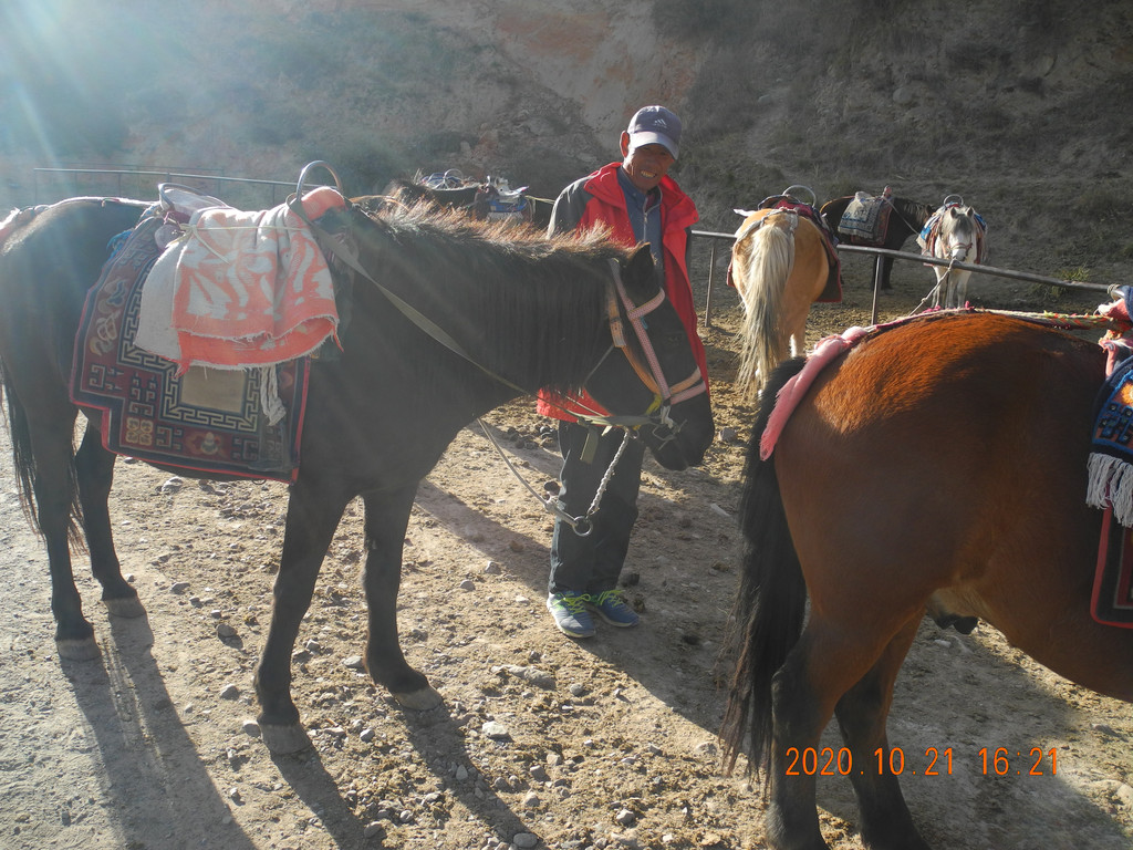 再看一眼。 三十三天洞窟下来后继续开车前行,兰花坪后面需要骑马进去。牵马的老板说临松山瀑布已结冰,没法看,我们信马由缰,走在山间牧场。