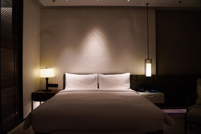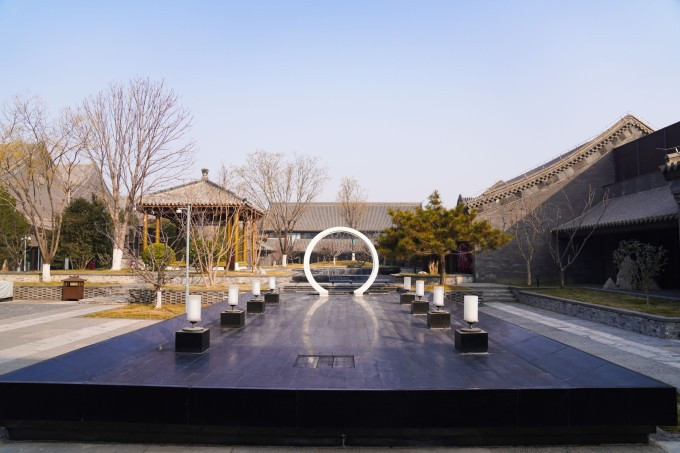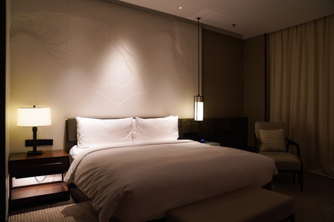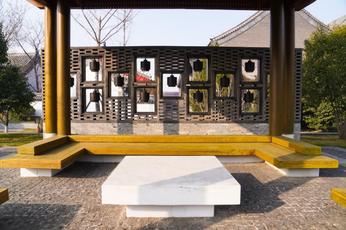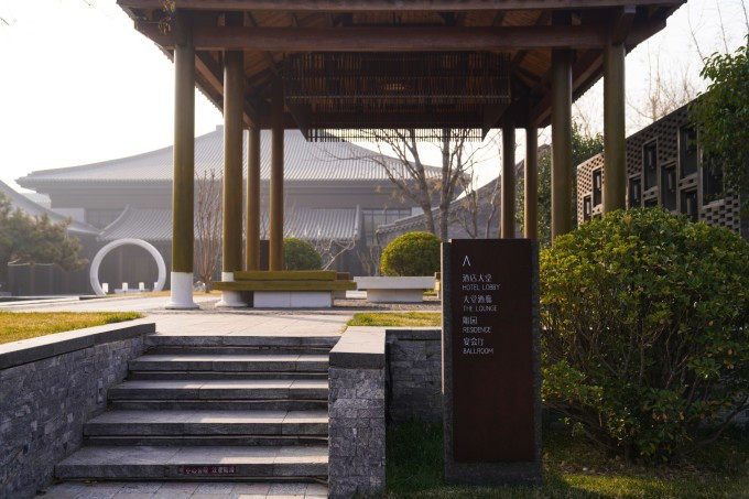 低密仿古,新中式儒雅之风,大气磅礴的庭院式建筑尽显礼乐之美,酒店的大堂再现了孔子杏坛授业的场景,金色漆面墙银杏叶落浮雕、深色木制家具,白色陶瓷屏风、书卷、石墙壁龛藏的玻璃灯罩等细节使整个空间充满了冥想境界般的静谧,带领住客游溯于古今之间。