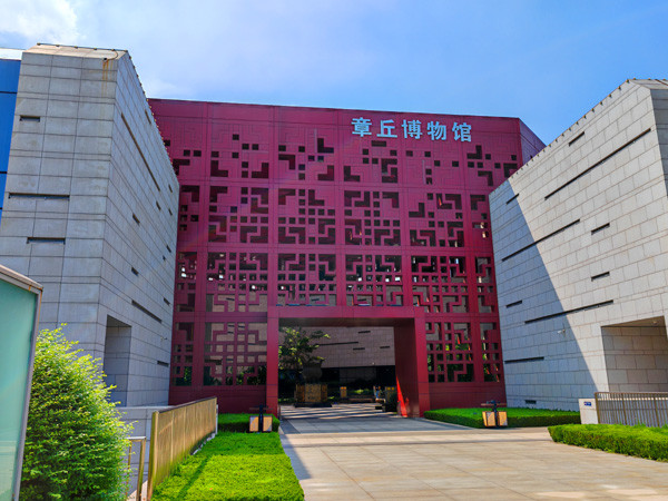 来到章丘博物馆前,一座宏伟的建筑矗立在我的眼前,只见其红色的外墙纹路独特,似万字纹又掺着套方锦,透着吉祥的寓意,也彰显着中国传统建筑的韵味与庄重。