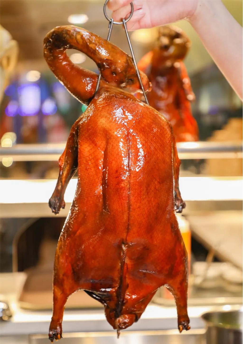 上桌前要入金汤池全方位洗礼,美鸽出浴,容光焕发!皮焦肉嫩时出炉,分切,装盘,一刻不耽误!