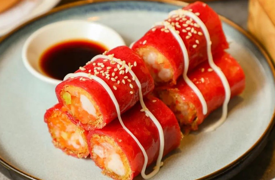 红米脆皮肠,红米磨浆做成红米皮,莫名喜庆!肠衣软滑柔嫩,里面包裹着虾仁脆皮,每一口都能吃到Q弹的虾肉,用料豪横,可想而知!