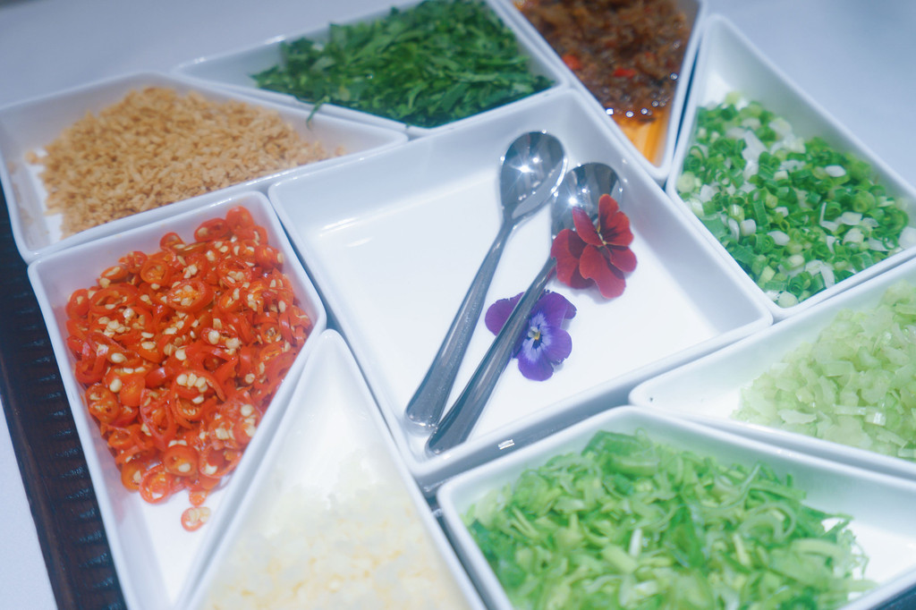 #九宫格调料#九宫格的摆盘造型漂亮,由芹菜叶子、芹菜、葱、辣椒、蒜泥等组成。根据自己口味选择调料。