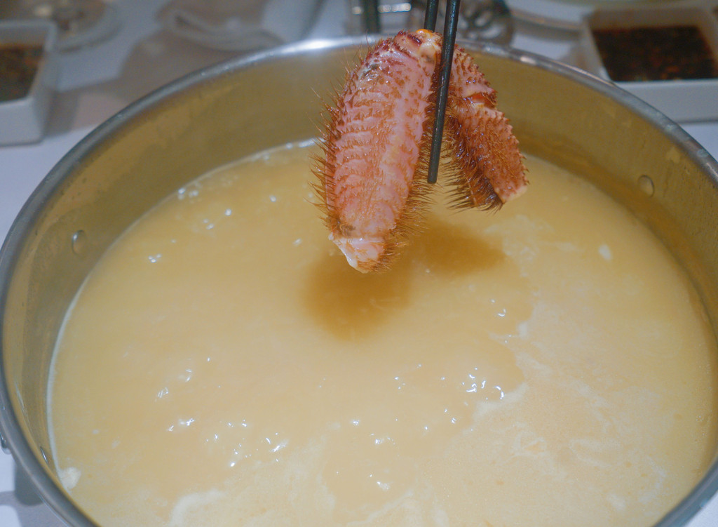 #红毛蟹#红毛蟹二吃,一是作赤身,二是放入我们点的汤底内刷后吃。精心挑选的红毛蟹与其他蟹不同,蟹黄蟹膏饱满,肉满紧致细腻润滑,不管哪种方式吃,你不仅能感受到视觉的冲击,更能体会到蟹独有肥美的美味,回味悠长。