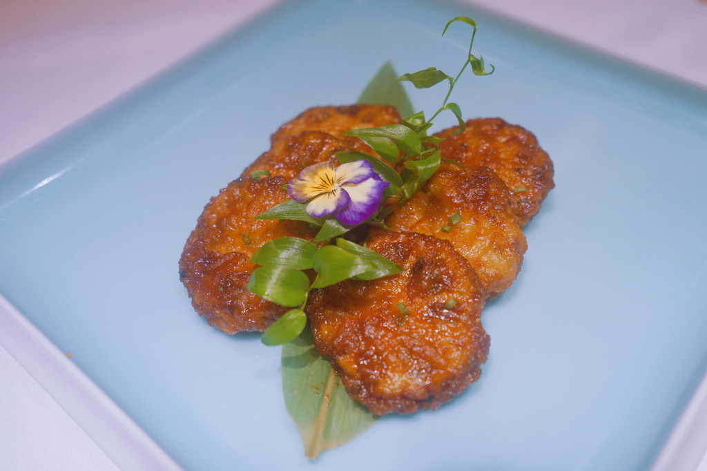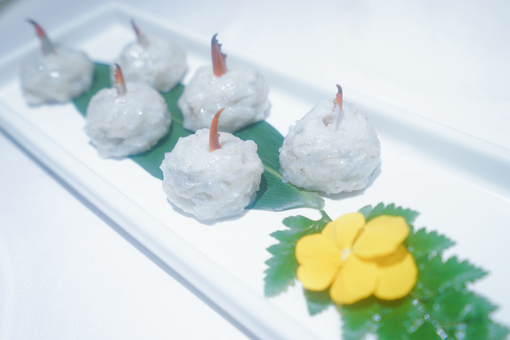#手打鲜蟹肉丸#端上桌上时,大家都被这造型别致可爱的鲜蟹肉丸吸引,纷纷拿起手机、相机拍摄头顶上多了一只角的蟹肉丸。出锅入嘴后口感鲜嫩。