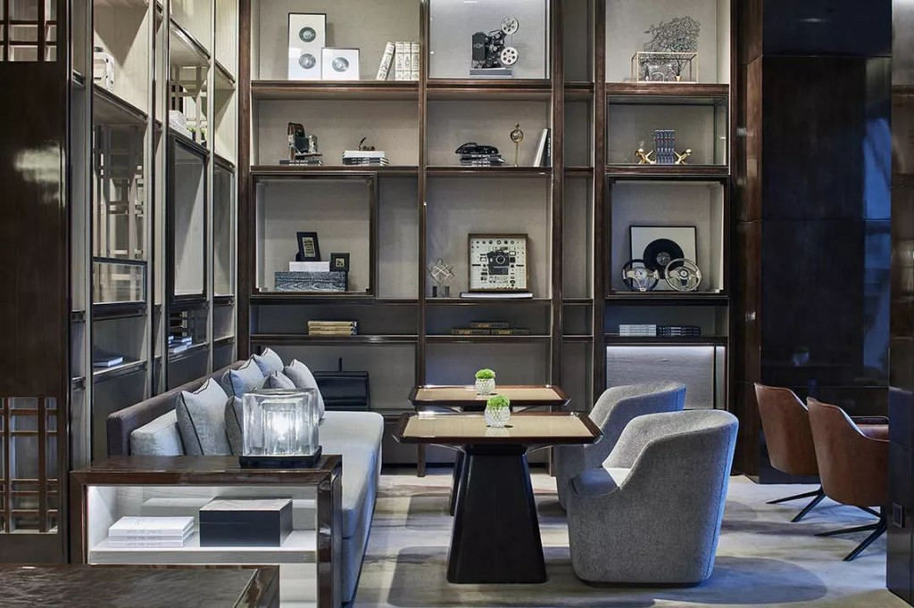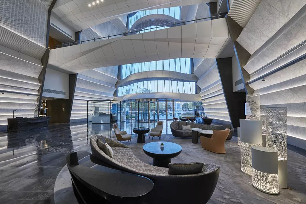 柜台如几何雕塑般呈现,不愧是奢华酒店之选,家具也都比拟河流上穿梭的大小船只,栖游其中。