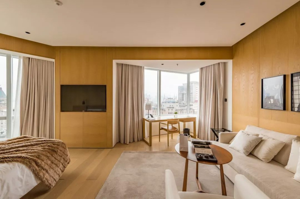 酒店里有近乎70%的空间是社交型共享空间,客房内部简洁素净,设计简约,全木的墙面搭配柔软的地毯,温馨而又舒适。