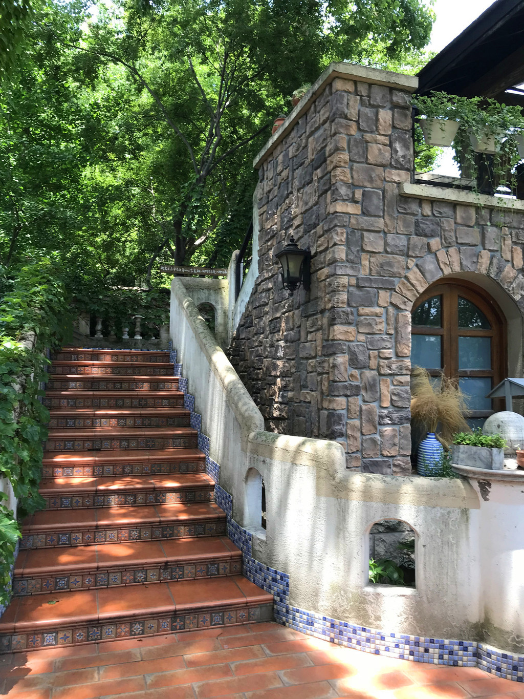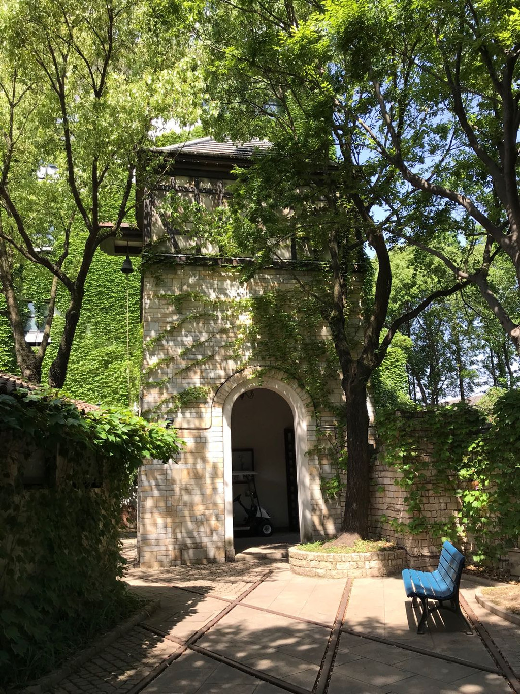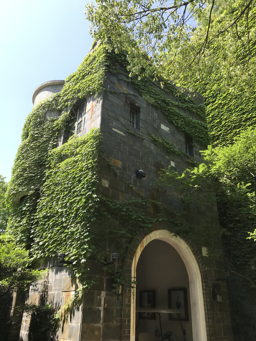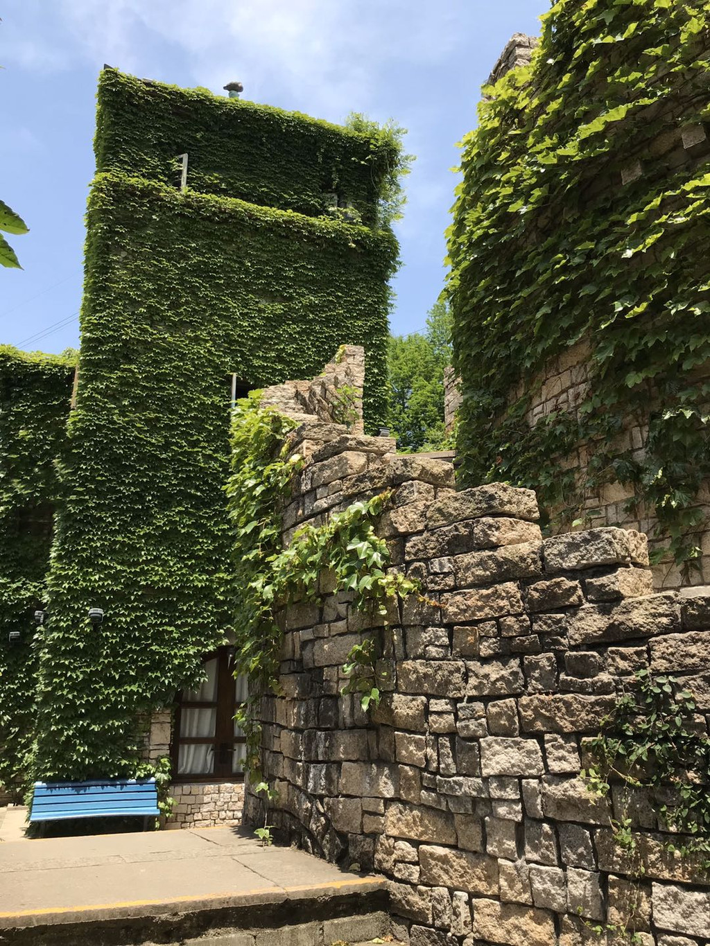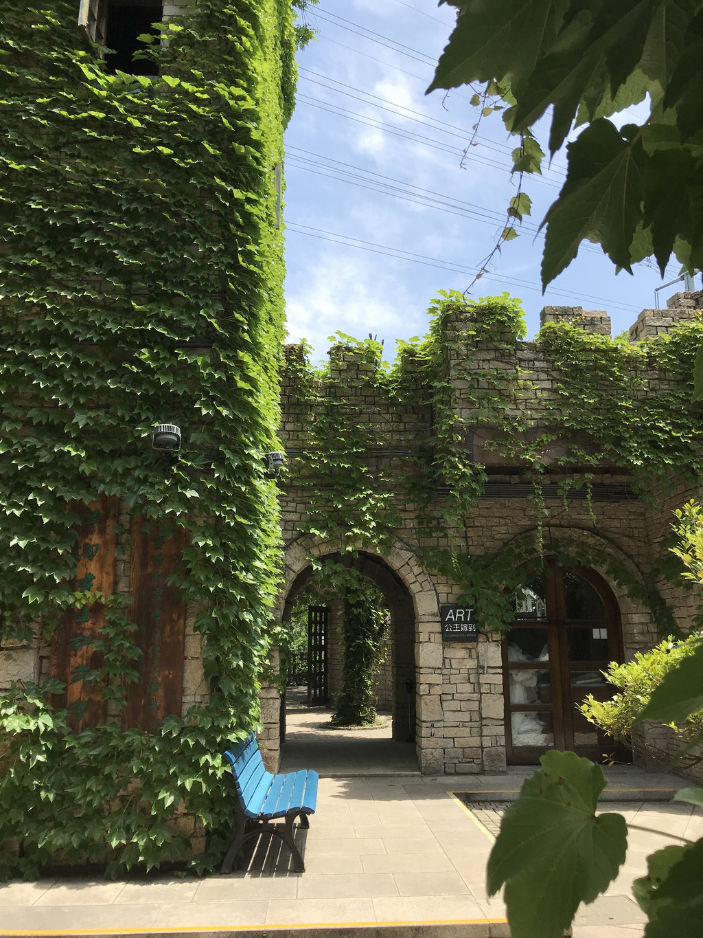 城堡的外墙完全是做旧的,而且长满了爬藤类植物。走在城堡的台阶上,来到顶端可以错落的看到地下的风景,同时还可以看到在隔壁一栋楼边上也有一个与之非常不搭的城堡的阁楼。我围着城堡转了一圈。