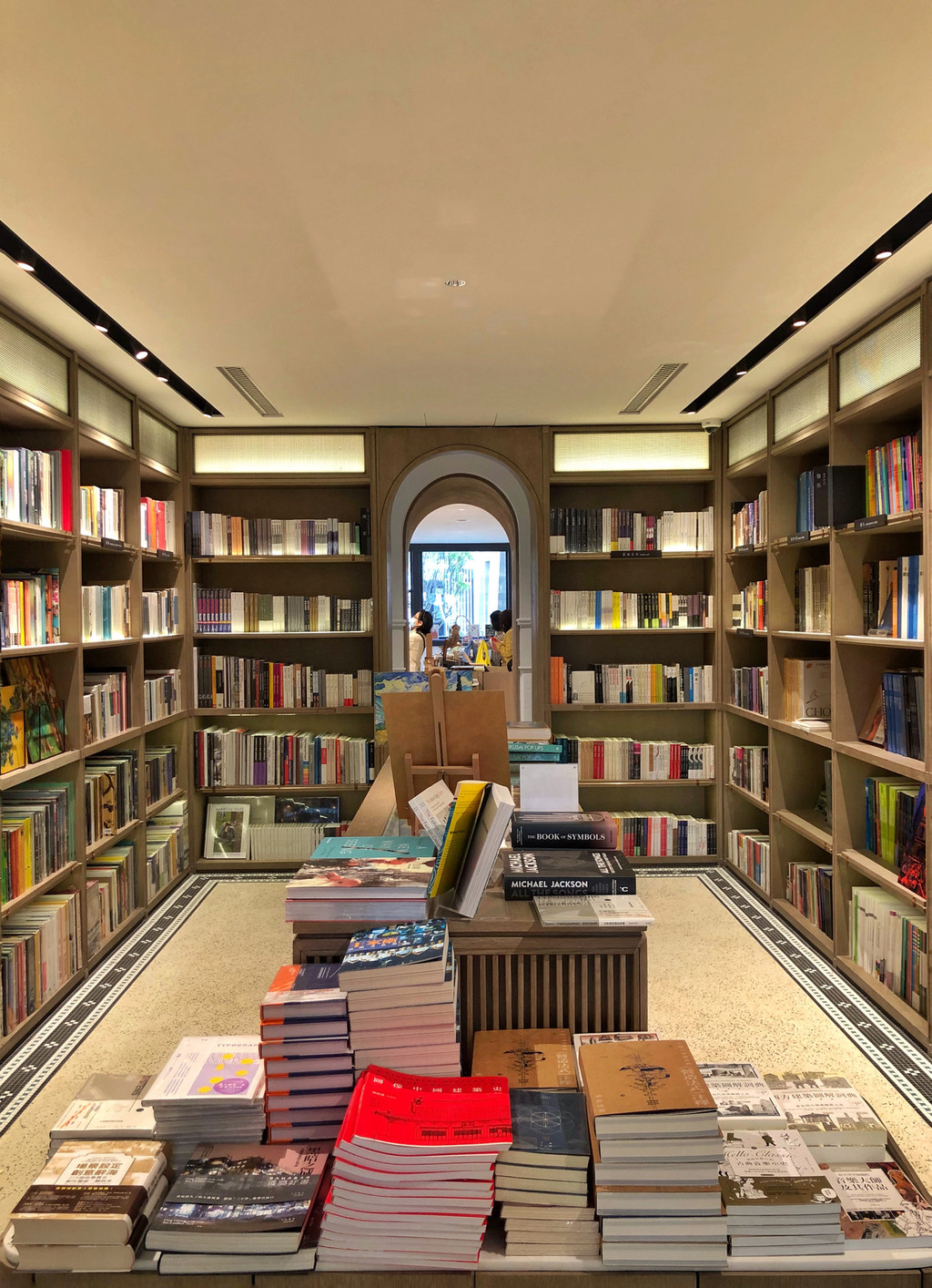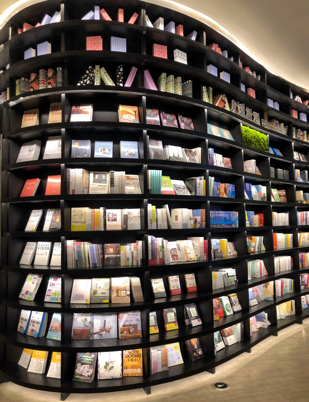 几何形的宽敞开阔的空间内,陈列了丰富多样的书籍种类,足以让人挑花眼,好在分类做得不错,让人很快就能找到自己喜爱的书籍。