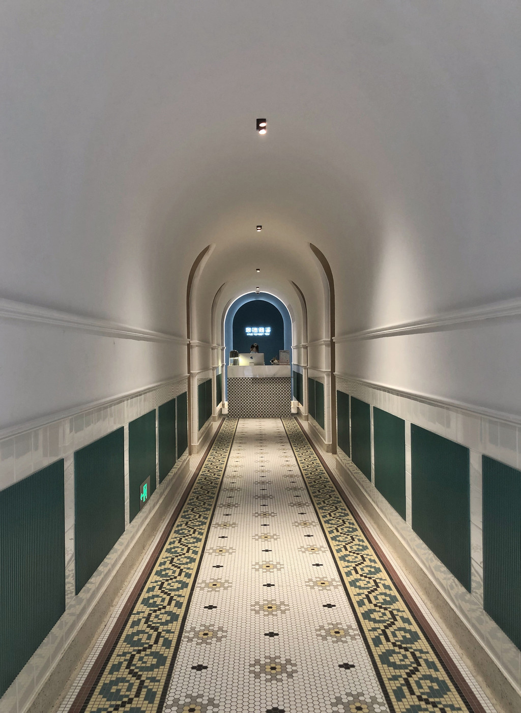 幸福集荟,位于上海黑石公寓一楼,从幸福集荟门口一踏入便能看见黑石公寓1924年马赛克地砖原貌。一条圆拱型长廊,白色主基调搭配墨绿色墙砖,地面铺马赛克地砖,深邃幽静同时有中田园浪漫气息。