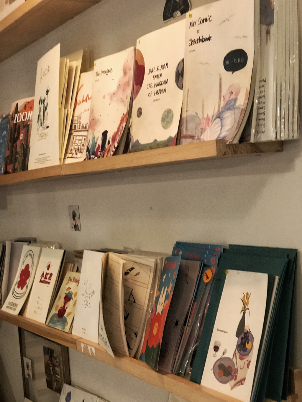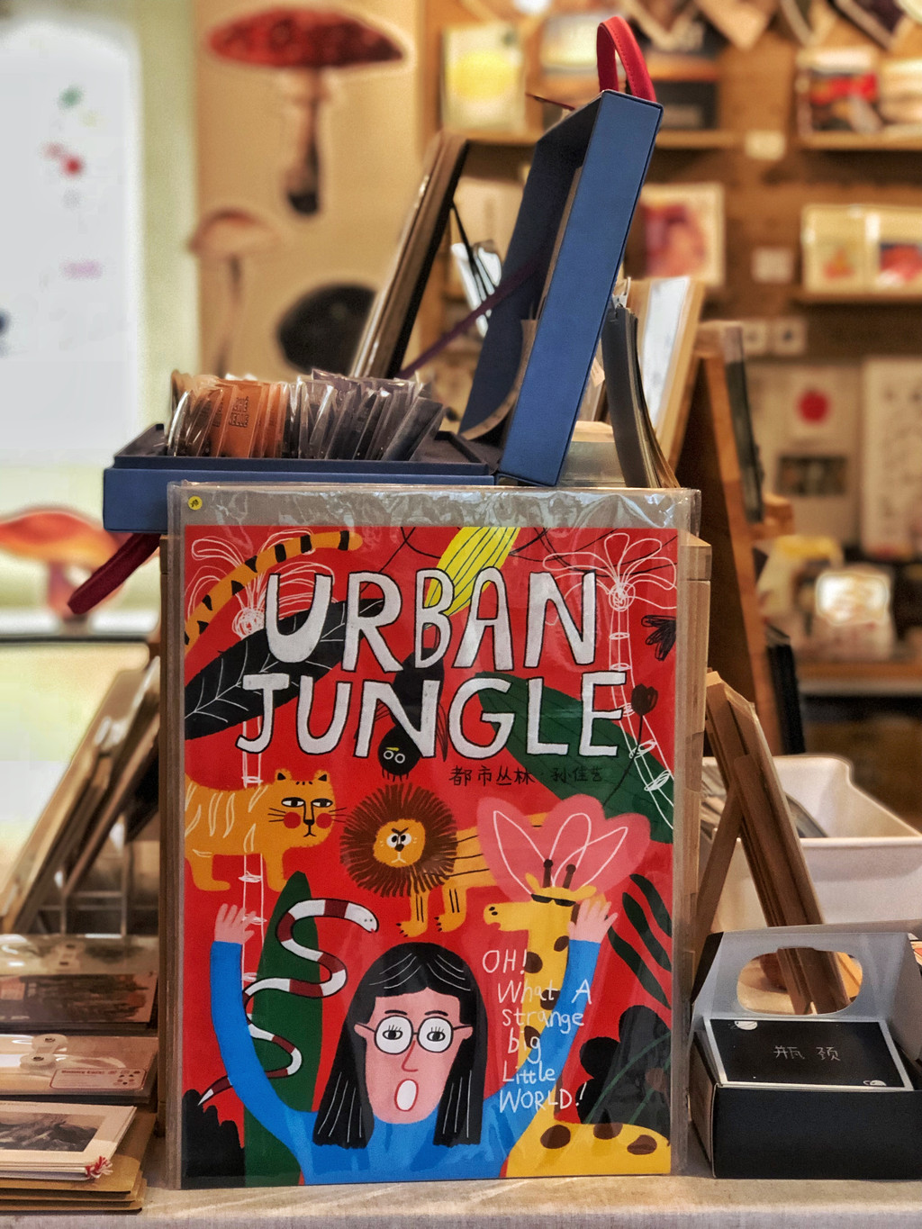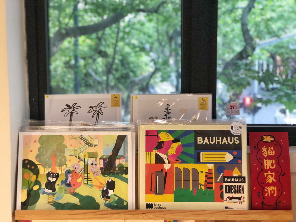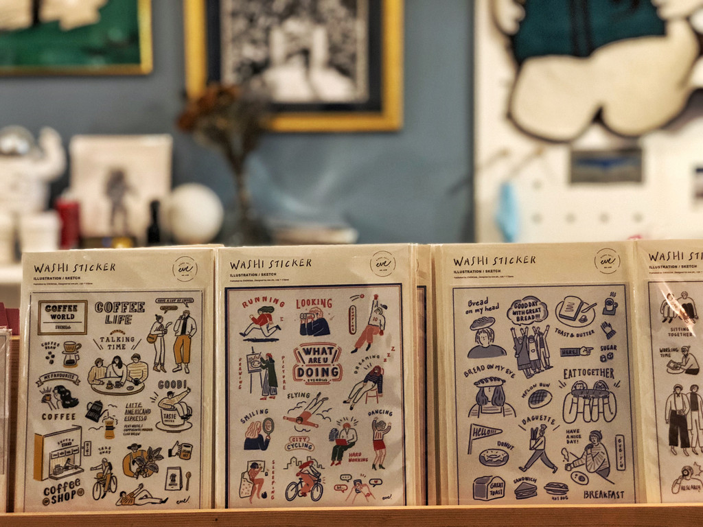 空间不算大也说不上小,50平左右的面积,不过大小不是重点,来到二楼,第一注意到的,一定都是店里摆的那些小众出版物和插画衍生品。其实鲸字号也有点像是关于插画的杂货店,关于插画的各种衍生周边,帆布袋、手机壳、异形明信片,虽然不像出版物那么多,却也差不多占了一面墙的位置。